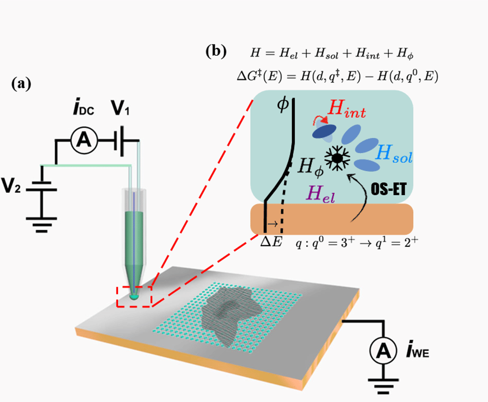 Figure 1. (a) shows a schematic SECCM setup used in our work and (b) shows the microscopic interactions of OS-ET used in the model Hamiltonian.