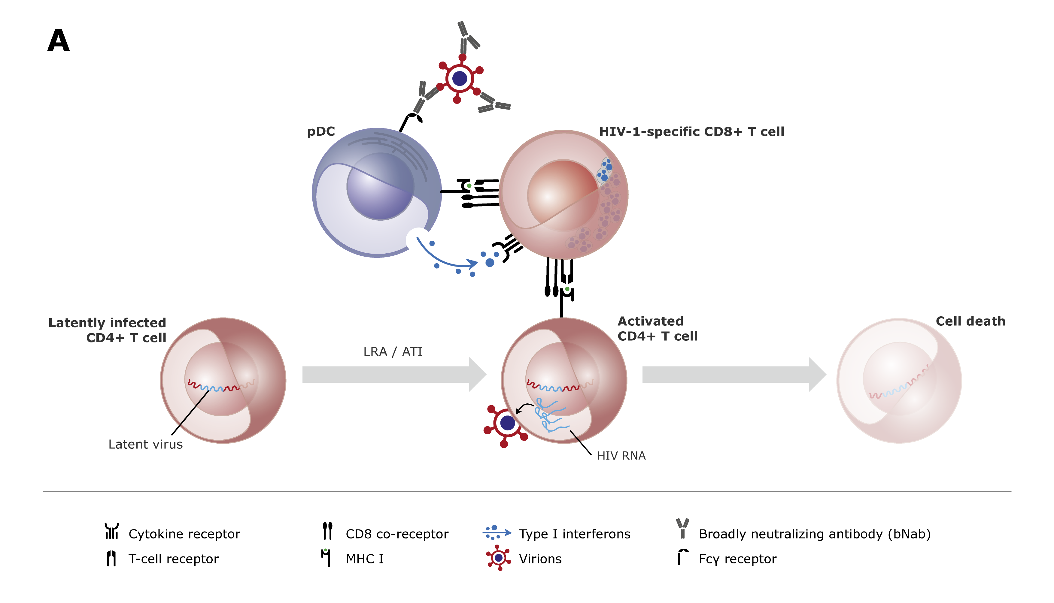 Many clinical trials have tested HIV curative strategies but most failed to make any impact on the number of infected cells (known as the HIV reservoir) or on the immune system ability to control the virus. Enhancement of the persons' immunity towards the virus has not been observed among peolpe living with HIV suppressed on long-term ART who receive bNAbs in addition to ART. In our study, we tried to intervene right as people with newly diagnosed HIV infection were starting ART. This approach is very different from previous studies which have tested interventions among people living with HIV who have been on ART for many years (figure 2a; below).