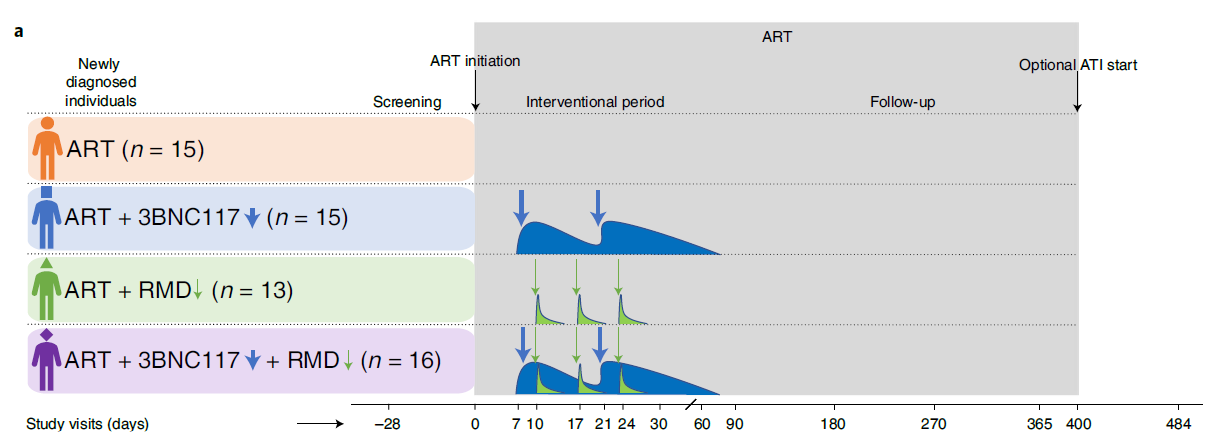 bNAbs mediates their antiviral effects through different mechanisms than regular small molecule antiretroviral drugs such as ART. In addition to direct neutralization of viruses, bNAbs can also engage the immune system through their Fc domains and form antibody–antigen immune complexes - for the Fc-mediated functions to occur antigen needs to be present, which is the case with viremia at ART start.
