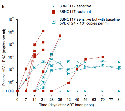 But in our randomized study we showed that newly diagnosed people with HIV given broadly neutralizing anti-HIV-1 antibodies (bNAbs) together with ART had a faster decrease in the amount of virus in the blood after the ART start and develop better immunity against the virus, and their immune system can partially or completely suppress the virus if ART is paused. Importantly, the proportion of individuals who were capable of partially or completely controlling the virus were much higher among those who had sensitive viruses and received bNAbs, than the rest of the study participants (figre 3b; below).