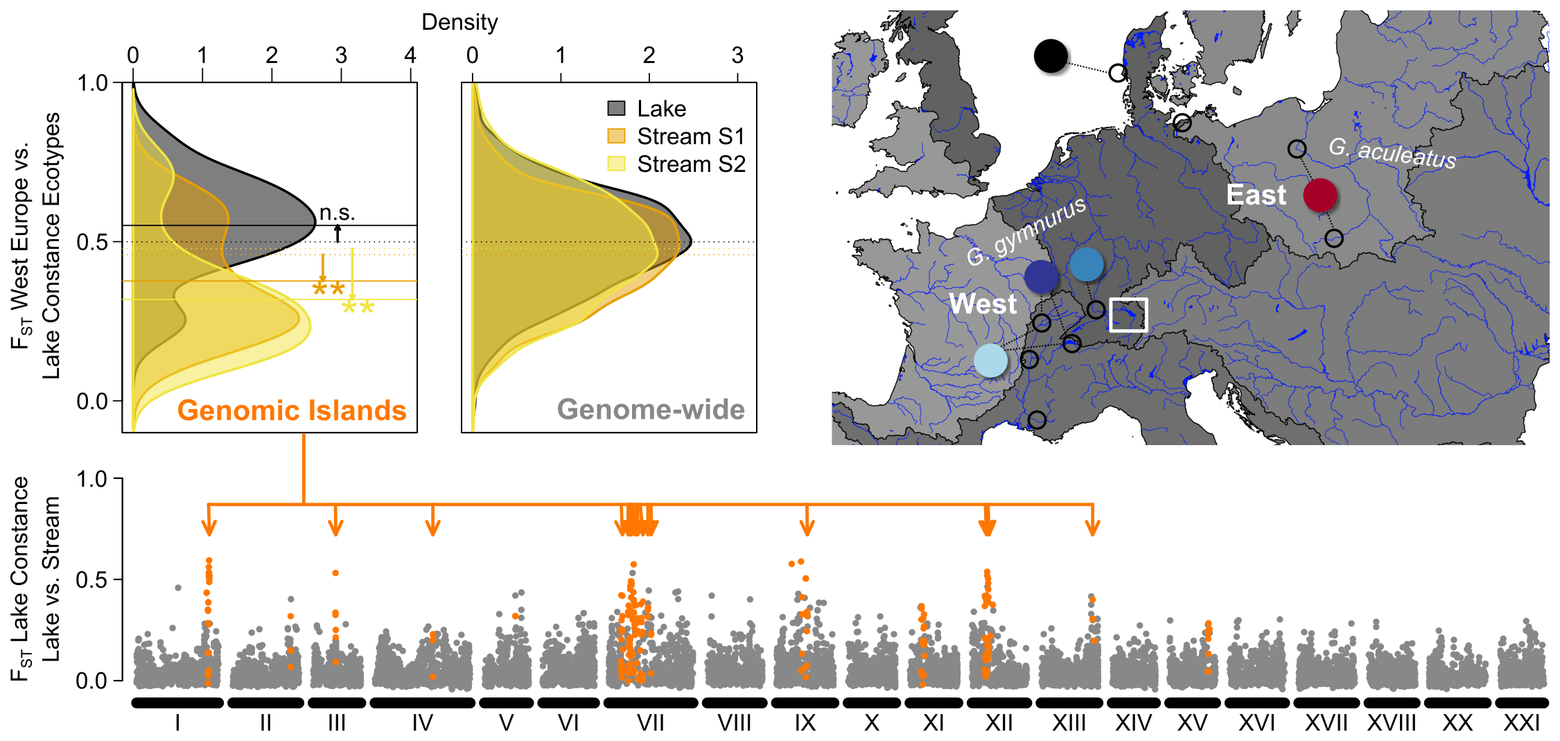 Lake and stream ecotypes from the South of Lake Constance differ in small segments in the genome (orange). In these regions, the stream ecotype shows signs of introgression from West European stickleback (Gasterosteus gymnurus), even though both ecotypes are predominantly of East European origin in the remainder of their genomes (Gasterosteus aculeatus). Figures: David Marques.
