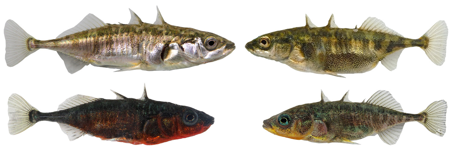 Lake (left) and stream (right) ecotypes of threespine stickleback in Lake Constance differ in many phenotypic traits, such as body armor, feeding morphology, coloration of females (top) and nuptial coloration of males (bottom). Photos: David Marques.