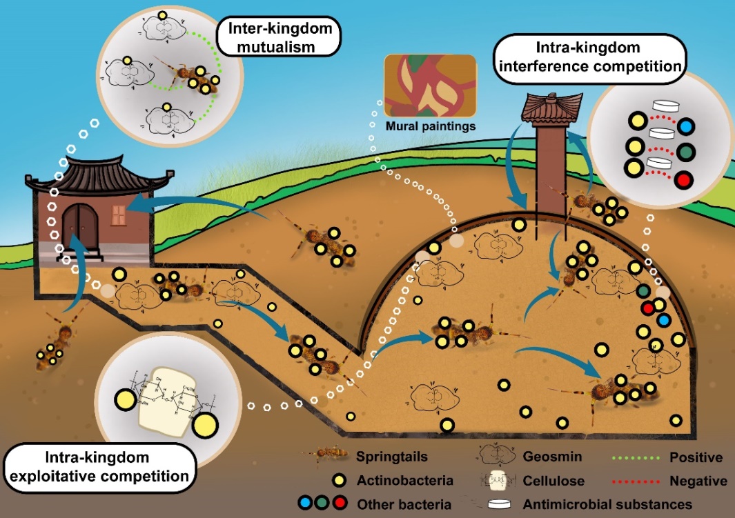 The conservations of subterranean cultural heritage sites, such as tombs and caves, and their inside ancient paintings and relics, are critical for preserving our cultural heritage. Microbial biodeterioration is a major concern for their conservation worldwide. However, we are still far from understanding the ecology regarding microbial communities thriving in these important historical cultural relics. This new study describes, for the first time, the multi-kingdom and intra-kingdom interactions between invertebrates and bacteria that help explaining the origin, dispersal, colonizing and dominance of key groups of microorganisms in subterranean cultural heritage sites.