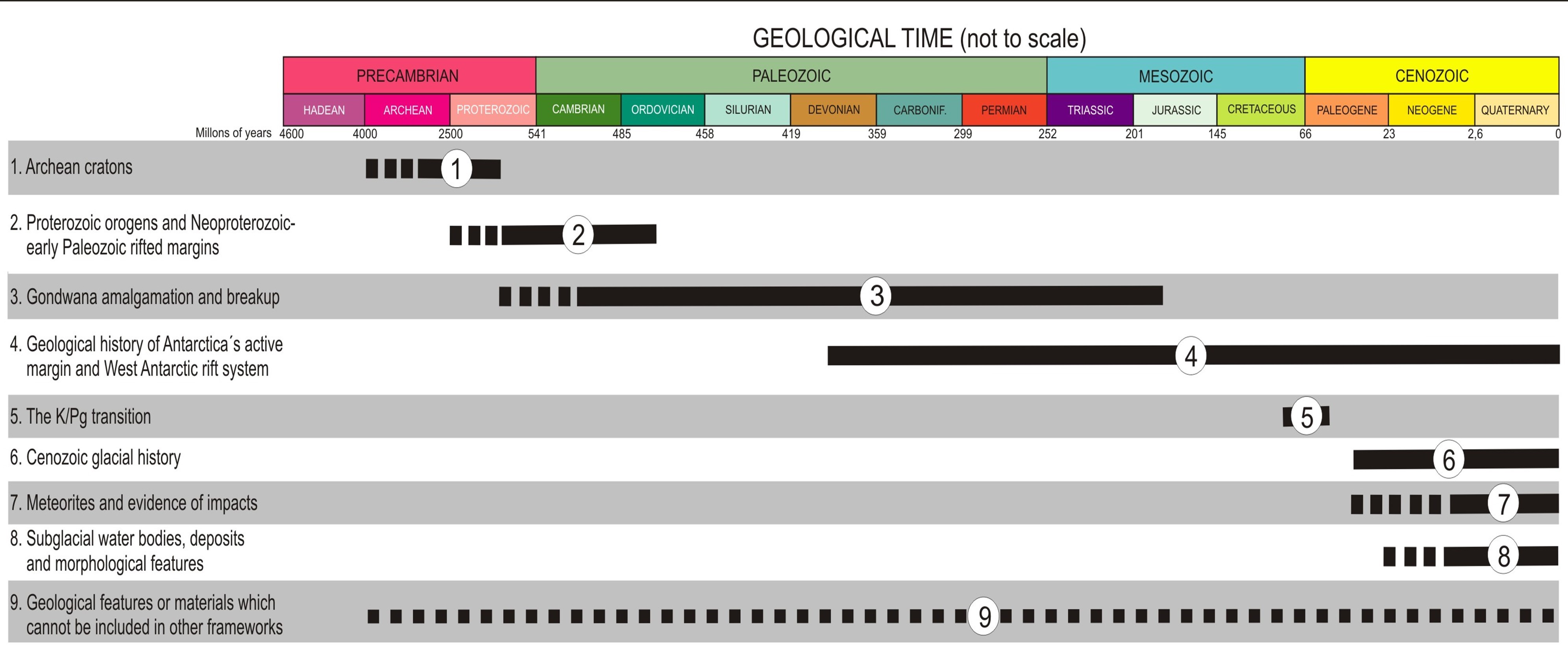 A Geological Framework refers to a regional geological feature, geotectonic unit, geological event, stratigraphic series, palaeobiological association, or any geological entity of international relevance. Following extensive expert consultation by a former SCAR Action Group, nine Geological Frameworks were identified and formally agreed upon for Antarctica.