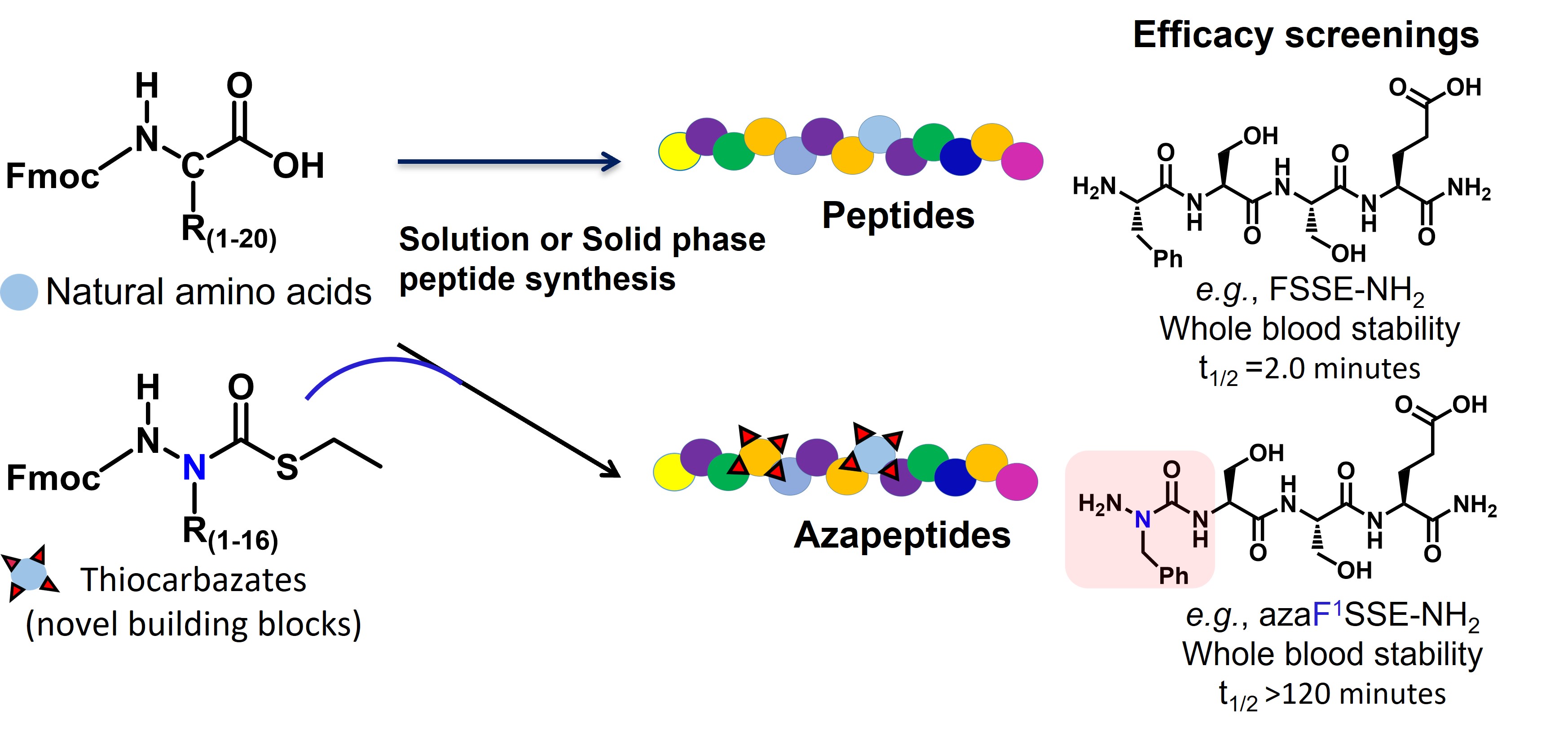 We have patented these unique thiocarbazate building blocks and associated methods and look forward to partner with academia and pharma companies to accelerate the field of therapeutic azapeptide development. In order to demonstrate the robustness of our system and methods we created targeted libraries of azapeptides around two peptides, FSSE/P5779- an HMGB1 (high-mobility group box-1) pathway antagonist, and bradykinin- an endogenous bioactive peptide. Using successive screening of library candidates, starting with ex vivo whole blood half-life, we selected lead azapeptide candidates from each peptide target and tested in both in vitro and in vivo efficacy studies to discover lead azapeptide therapeutic candidates for both peptide targets. These proprietary azapeptide building blocks and methods, combined with efficacy screening can be used to rapidly and efficiently select and develop leading azapeptide-based therapeutics. You can read more about our approach and methods in the paper in Nature Communications, https://www.nature.com/articles/s41467-022-34712-9