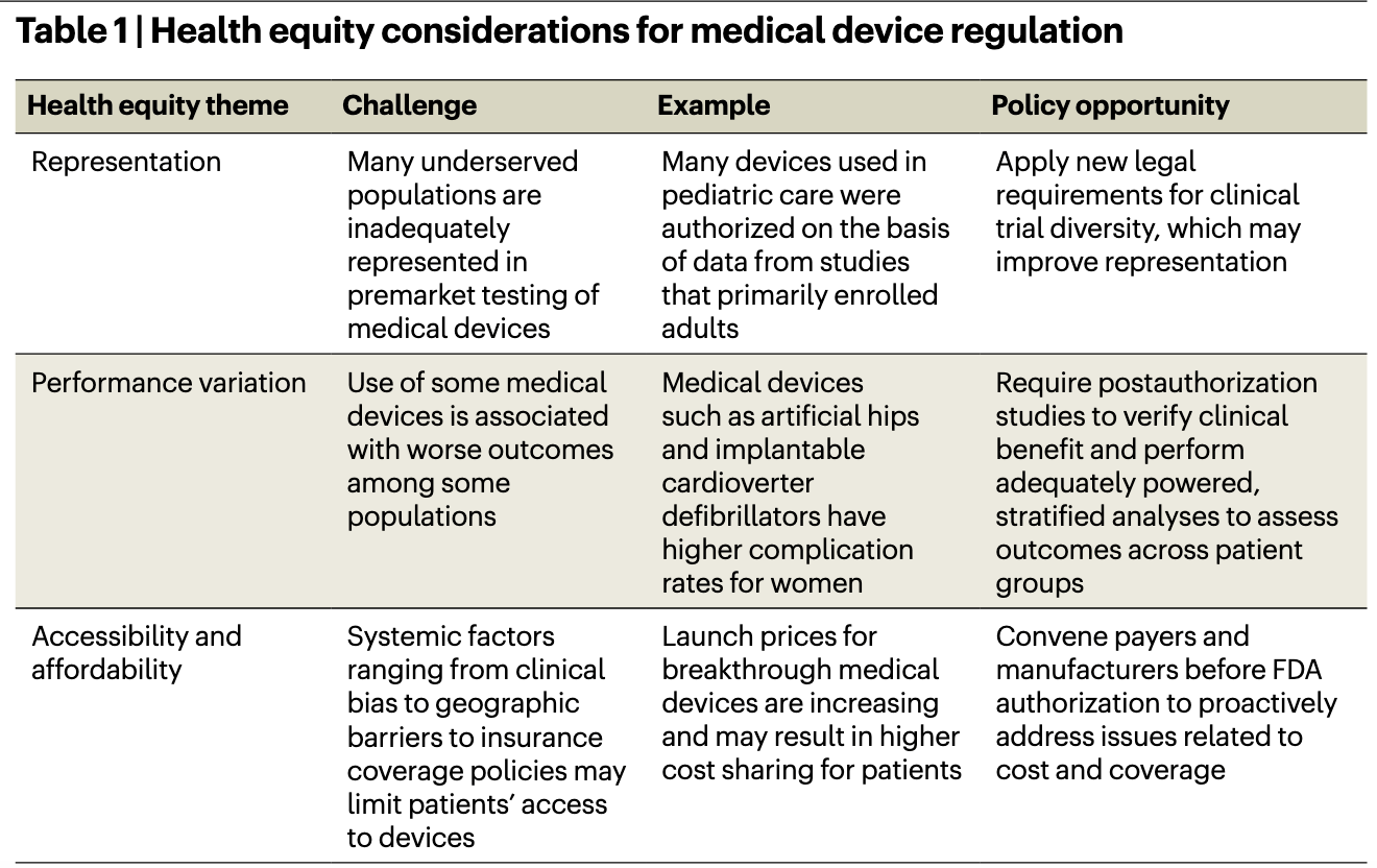These examples illustrate the need for reforms that advance health equity during medical device development. In our new article published in Nature Biotechnology, we explore the core equity considerations for medical device regulation, including clinical trial representation, performance variation, and accessibility and affordability (Table).6 We examine these themes in the context of a recent proposal from the Food and Drug Administration (FDA) to embed equity considerations into the agency’s Breakthrough Devices Program (BDP).