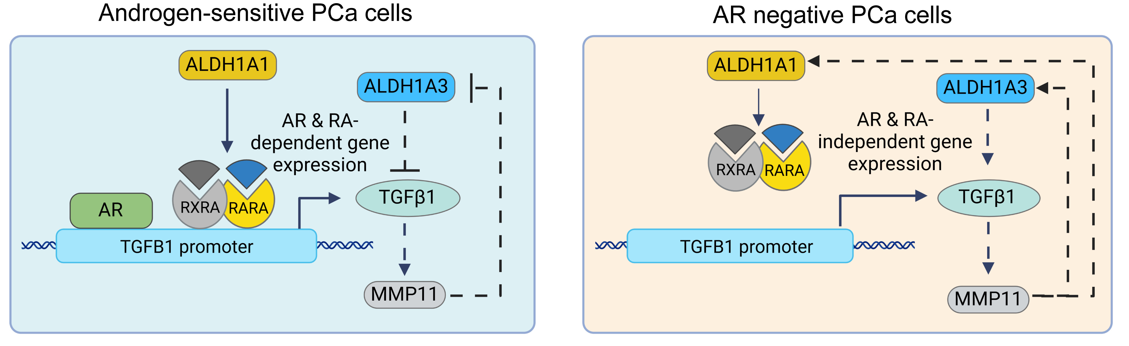 Figure 1. ALDH1A1 regulates TGFB1 expression in androgen-sensitive cells through AR- and RA-dependent mechanisms. In contrast, the interplay between TGF-β1 and MMP11 is present in the androgen-sensitive and castration-resistant models of PCa.