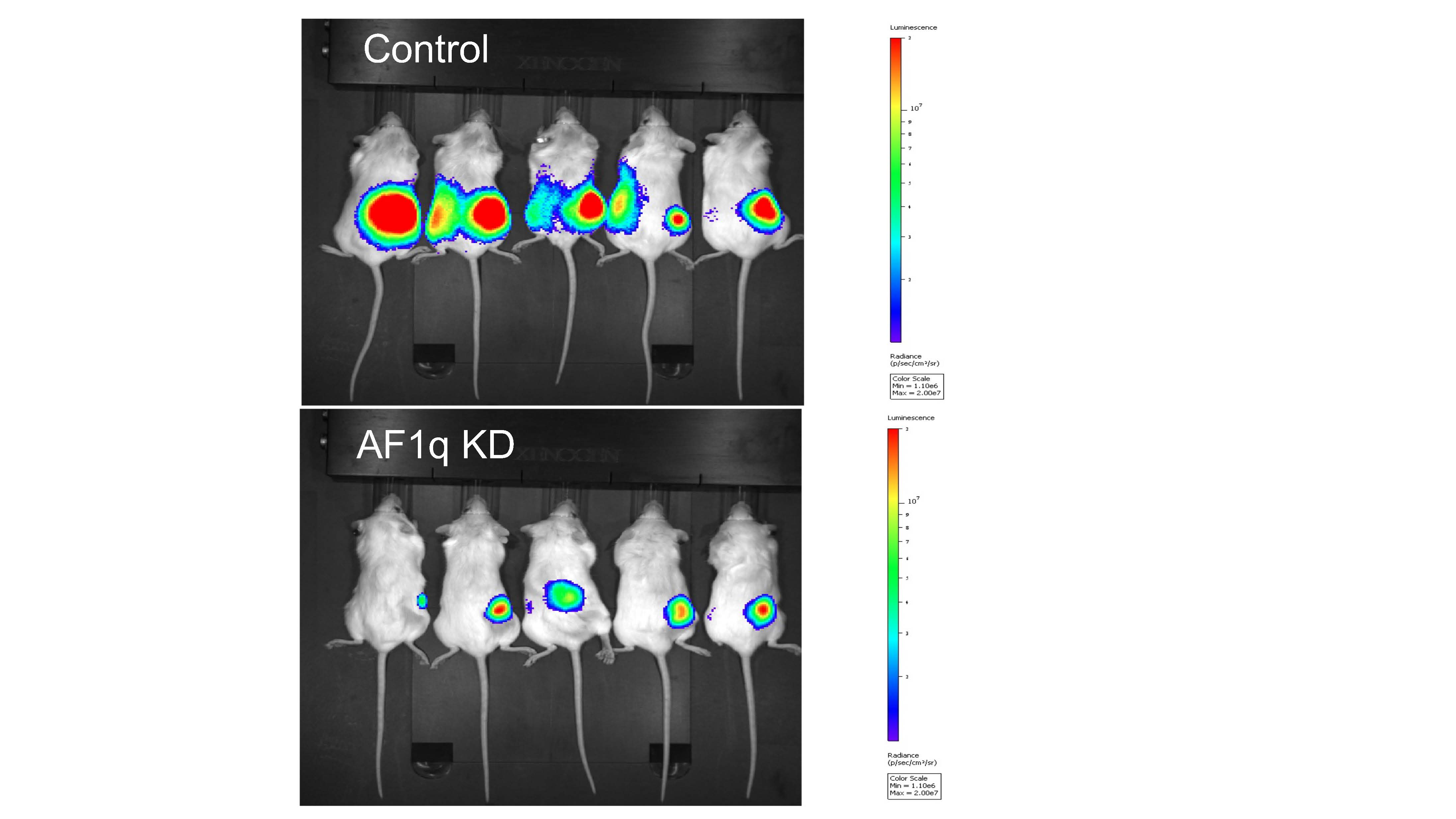 Figure 3. In vivo tumorigenicity of neuroblastoma cells requires AF1q expression. Tumor bioluminescence of AF1q knockdown (AF1q KD) and control Kelly cell xenografts imaged at 30 days after implantation into nude mice.