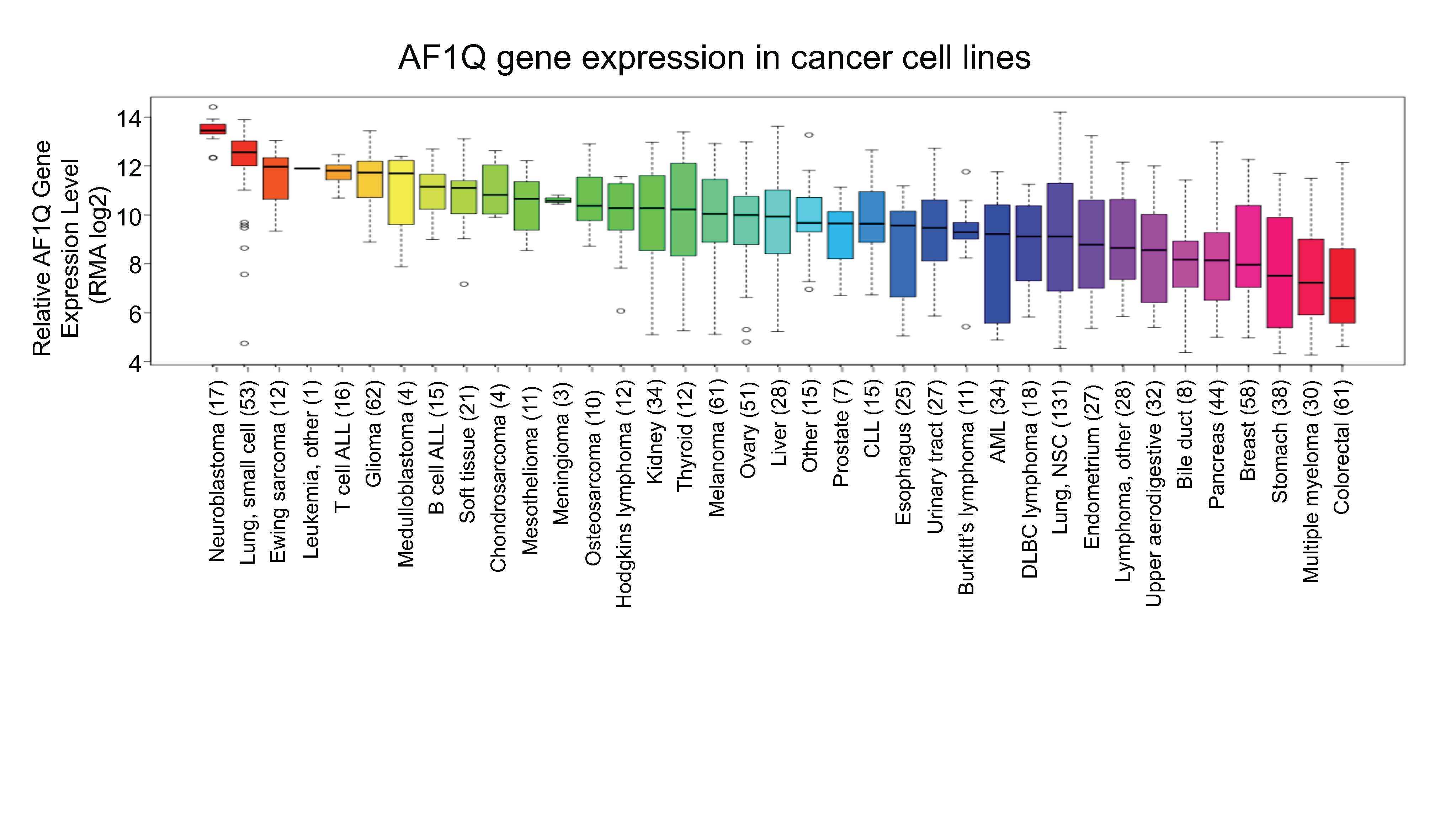 Using the Broad Institute’s Cancer Cell Line Encyclopedia database to compare AF1Q gene expression in 37 different types of pediatric and adult malignancies, we found that AF1Q was expressed at the highest levels in neuroblastoma compared to all other tumor types (Figure 2).