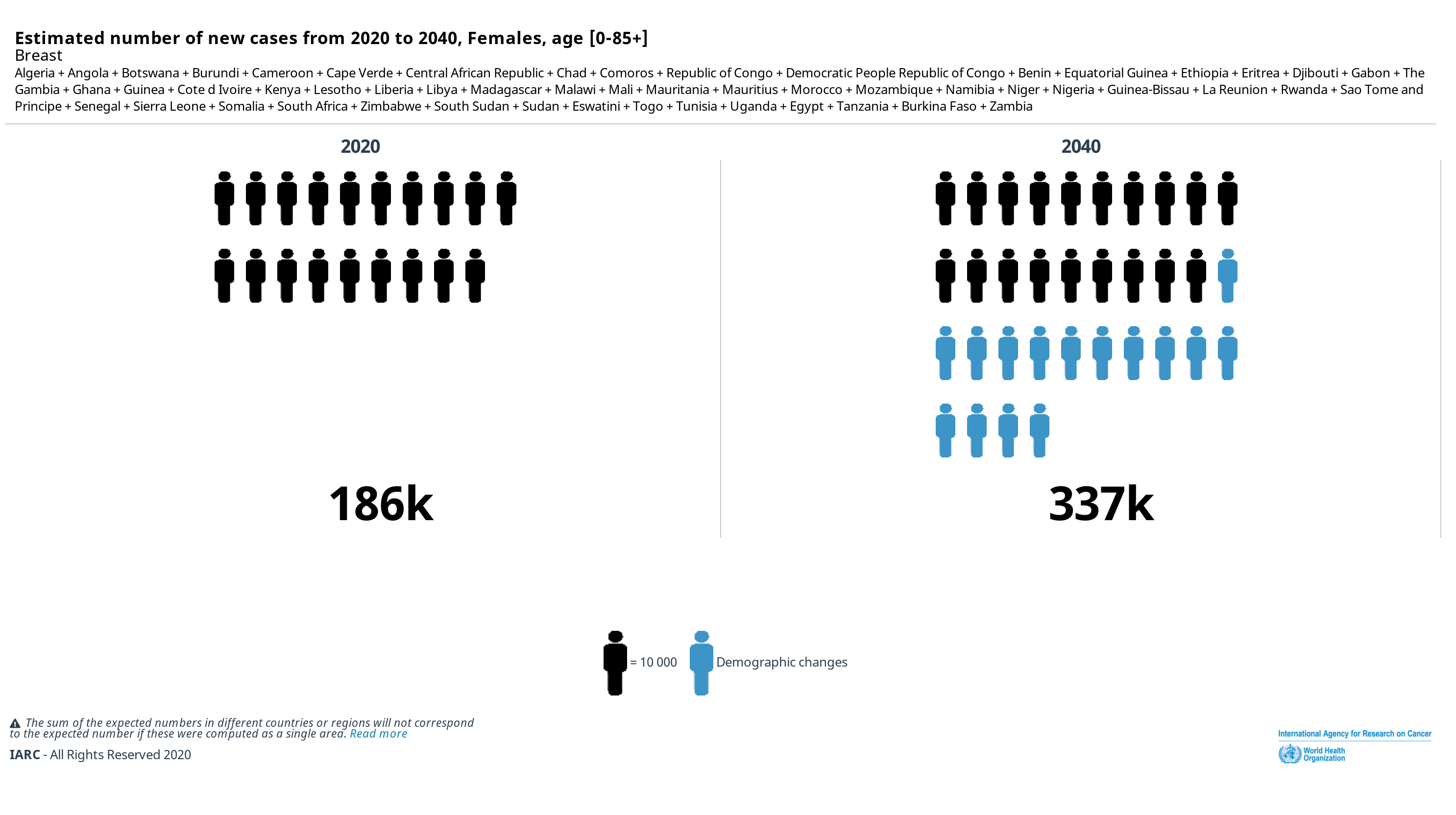 The Global Cancer Observatory (GCO), estimates breast cancer incidence and mortality rates to increasing rapidly, almost doubling by 2040, as indicated in the graphic below.