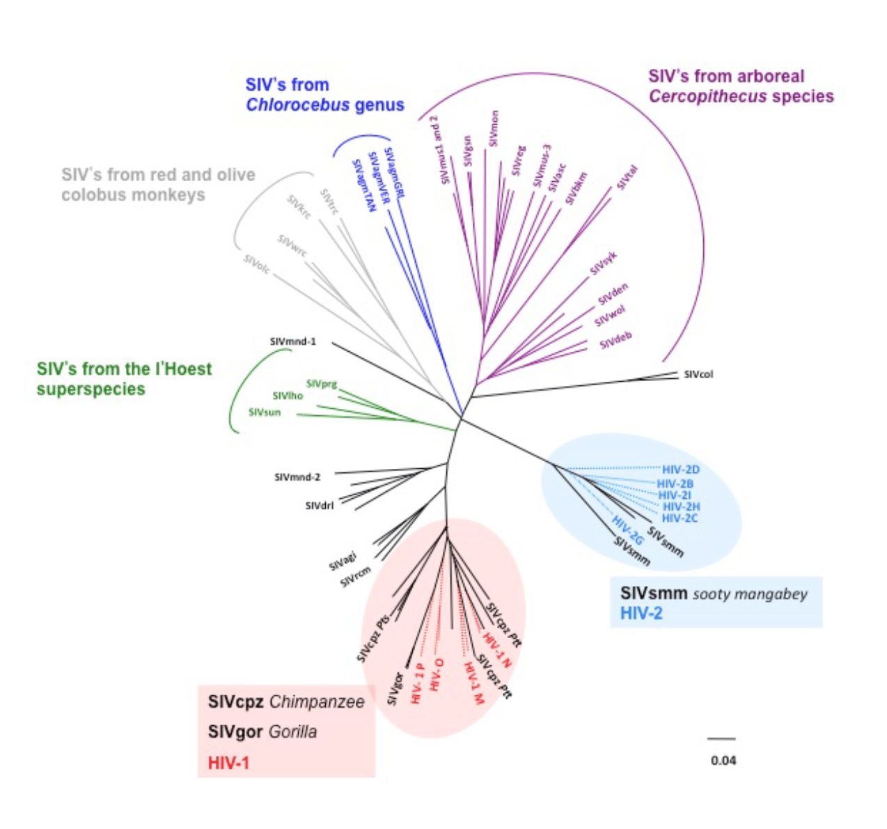 As the reader may well know a lentivirus was identified in rhesus macaques presenting with AIDS in 1985 (11). How was this simian immunodeficiency virus (SIV) overlooked? The premium had been on oncogenic and experimentally tractable viruses of course. Circa 1985, immunosuppression was typified by children living in bubbles or terminal stage cancer patients. Acquired immunosuppression was unheard of. HIV-2 was quickly discovered in 1986 and its genome proved isogenic to the macaque lentivirus (12,13). As things would have it, this virus was not natural to the rhesus monkey but had come from humans experimenting with cancerous material. It transpired that an endogenous asymptomatic lentivirus of sooty macaques had jumped over to humans spawning HIV-2, again sometime in the early 20C. By contrast HIV-1 and HIV-2 differed by two mutually exclusive orfs so while we were further on, the mystery continued. By now researchers were starting to smell a rat and started looking at African apes and monkeys.