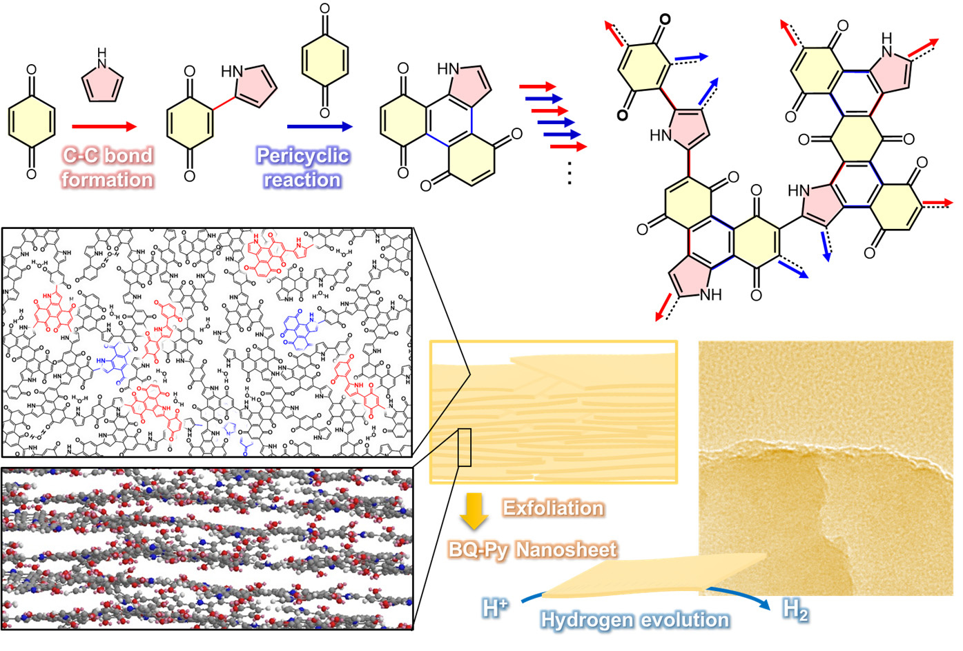 Our group has published ‘Amorphous 2D materials containing a conjugated-polymer network’ in Communications Chemistry 2019, 2, 97 .1 This paper reported on amorphous two-dimensional (2D) materials based on conjugated-polymer network synthesized by random copolymerization of the two monomers, such as benzoquinone (BQ) and pyrrole (Py) (Figure 1). The random stacking of the amorphous polymer networks forms the low-crystalline layered structures leading to the exfoliation into the nanosheets. The resultant BQ-Py nanosheets showed the high catalytic performance for hydrogen evolution reaction.