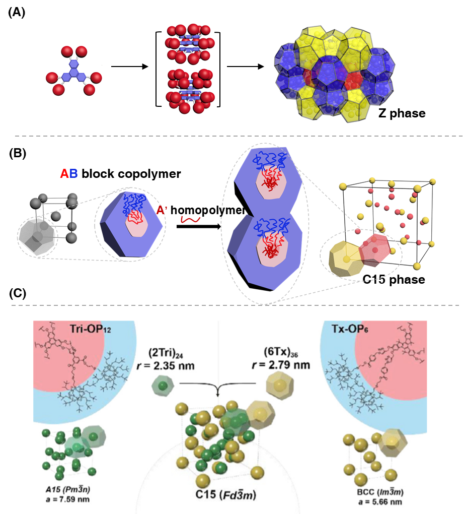 Figure 1. (A) The schematic illustration of the Z phase formation mechanism based on nano-sized shape amphiphile. (B) The schematic illustration of the AB block copolymer/A’ homopolymer blends in the dry-brush model. After adding the homopolymer, a volume-symmetric bcc phase transforms into a volume-asymmetric C15 phase. (C) The schematic illustration of the C15 phase formed by giant molecules blending system.