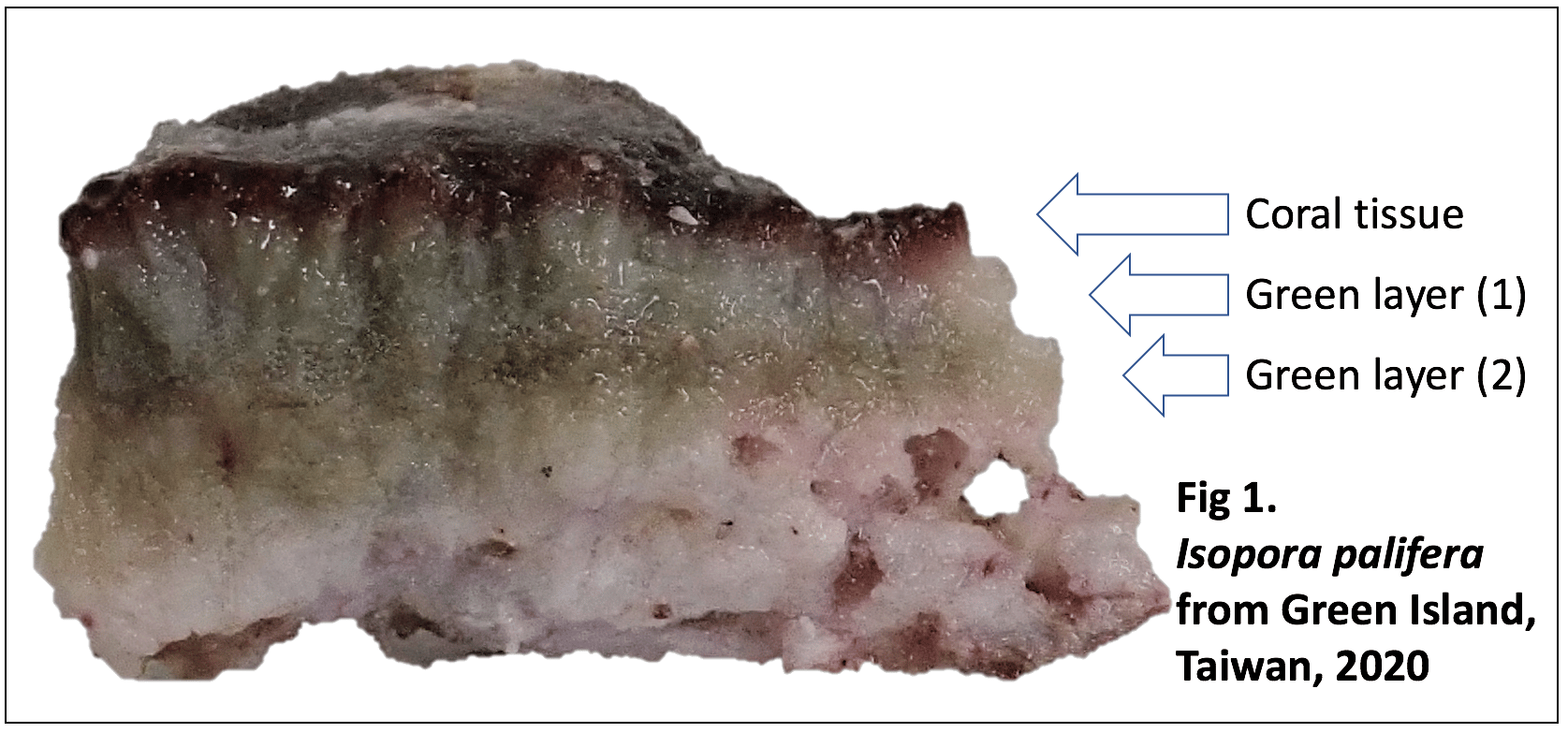 After publishing our findings on endolithic microbes in 2019, Dr. Shan-Hua Yang, accepted a tenure-track faculty position at National Taiwan University, the best university in Taiwan. She continues to study coral-associated bacteria, including coral skeleton microbiology. We are now using metabolomics and stable isotope-labelling approaches to investigate the mechanism and chemicals involves in the interaction between endolithic bacteria and their coral hosts. Moreover, we continue to explore the green layer, which constitutes specific green sulfur bacteria called coral-associated Prosthecochloris (CAP), in the coral Isopora palifera, and have uncovered more specific micro-niches in the tiny layer that are actually occupied by different CAP groups (Fig 1), suggesting that a) the coral skeleton houses more diverse, heterogeneous micro-niches than previously thought and b) the environmental properties of these micro-niches can vary. It also suggests that the ecological functions of coral skeleton microbes are dynamic, complex, and far reaching.