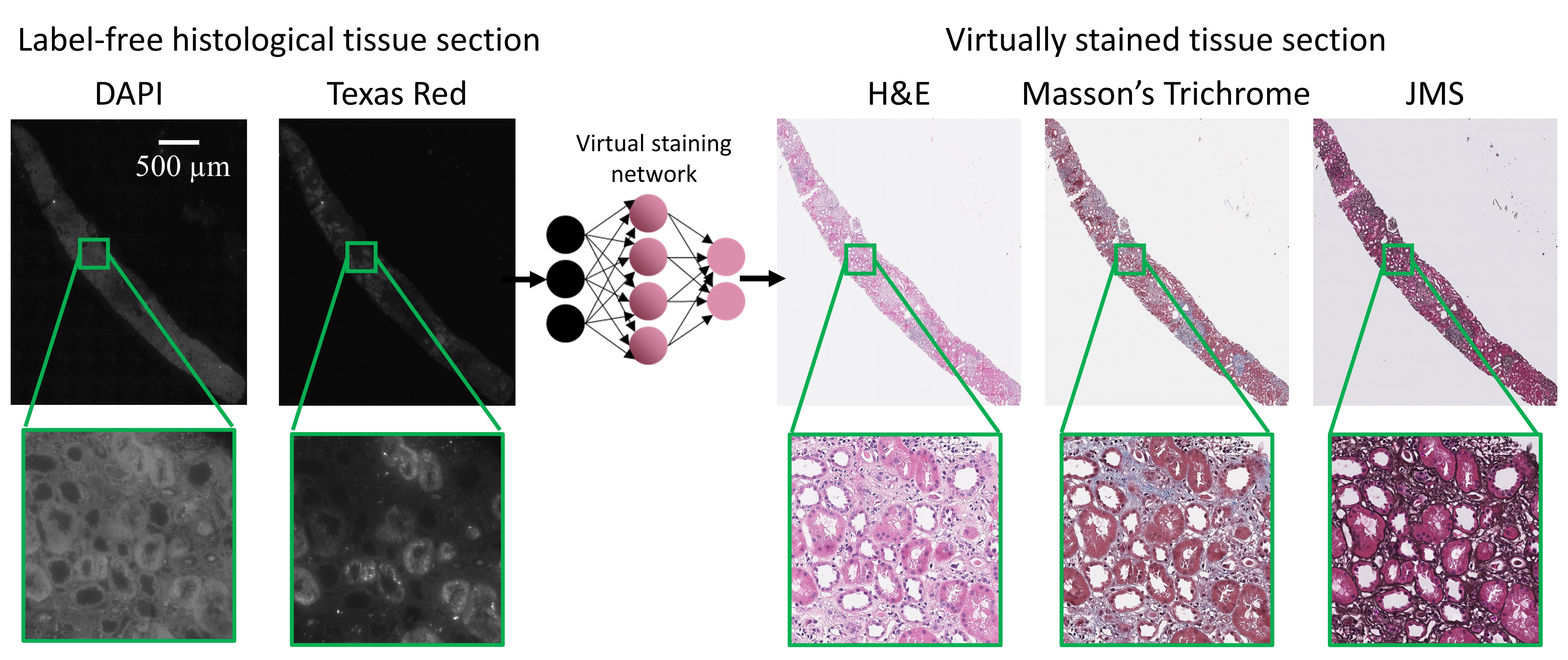 Over a year ago, we published our paper in Nature Biomedical Engineering which introduced a deep learning-based method to “virtually stain” autofluorescence images of unlabeled histological tissue sections, eliminating the need for chemical staining1 (see the Figure). This technology was developed to leverage the speed and computational power of deep learning to improve upon century-old histochemical staining techniques which can be slow, laborious and expensive. In our paper we showed that this virtual staining technology using deep neural networks is capable of generating highly accurate stains across a wide variety of tissue and stain types. It has the potential to revolutionize the field of histopathology by reducing the cost of tissue staining, while making it much faster, less destructive to the tissue and more consistent/repeatable.