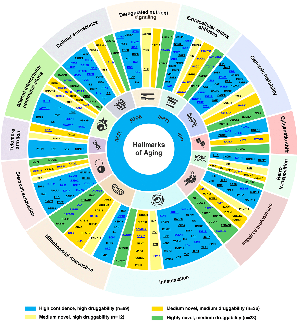 In just two months’ time, Insilico also used PandaOmics to uncover multiple targets specific to both aging and disease, a finding that could lead to the development of dual-purpose therapeutics. Identifying such targets could provide added effectiveness for older patients who are suffering from disease, as well as delaying or reversing certain aging symptoms in addition to treating disease symptoms. In the study, Insilico deployed PandaOmics to perform target identification for 14 age-associated diseases and 19 non-age-associated diseases across multiple disease areas to identify targets of age-associated diseases. PandaOmics revealed 145 genes that were considered potential aging-related targets and mapped these into corresponding aging hallmarks, including 69 high confidence targets with high druggability, 48 medium novel targets with high or medium druggability, and 28 highly novel targets with medium druggability. The results were published in March 2022 in the journal Aging.