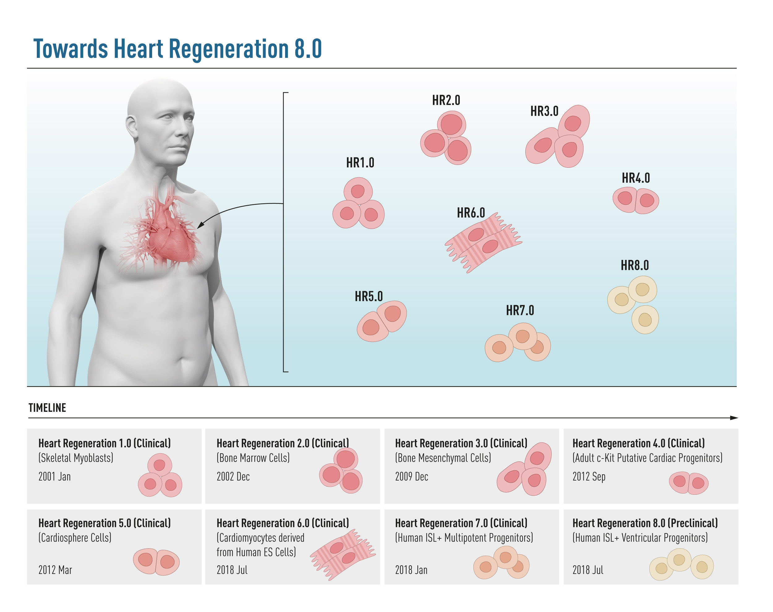 For the past 7 years, our labs at Karolinska Institutet (KI; Chien) and AstraZeneca (AZ; RFD) have been working on vascular regeneration by translating work initially done in mice (11) to large animals (12) and onward to First Time in Human (FTIH) studies, that were published in Nature Communications (13) just shortly before our NPG piece. At the time, our collective thinking already was beginning to turn to heart muscle cell regeneration, based on a long series of studies spanning 15 years based on the discovery of multipotent heart progenitors that build the heart in all mammalian species (Figure 2)(14-19).