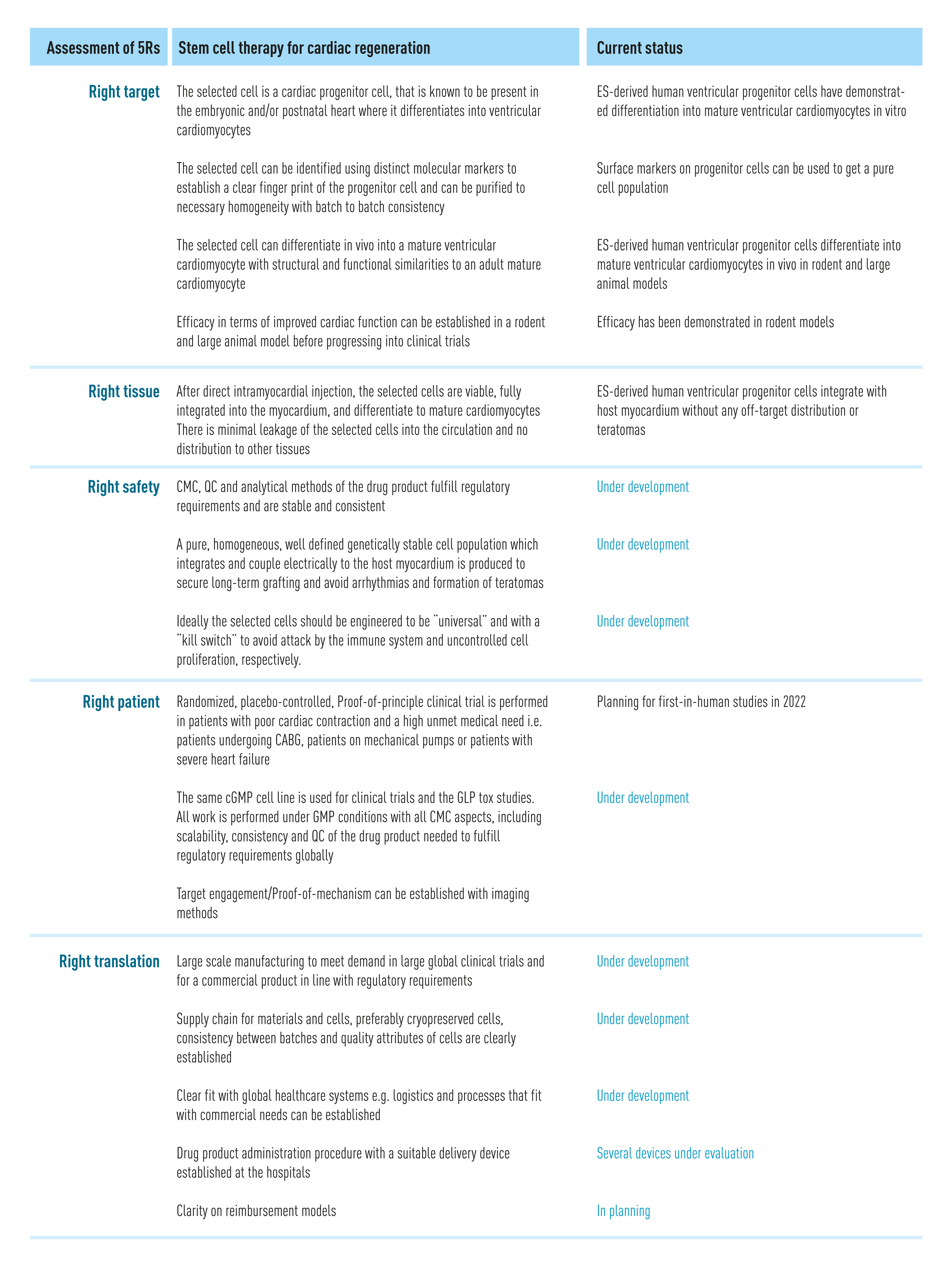 For the CVRM field, the future is likely to go beyond human ventricular progenitors (HVPs) to encompass other unmet clinical needs (25). Despite recent advances in reducing the morbidity and mortality of cardiovascular, renal and metabolic diseases such as the approvals of SGLT2 inhibitors, there is currently no therapy which stops disease progression. CVRM diseases are degenerative and the only curative option today is organ transplantation, an option for few patients due to the lack of donor organs. Recent advances in the science behind renal and liver regeneration are additional areas where cell therapy is likely to play a key role in the future.