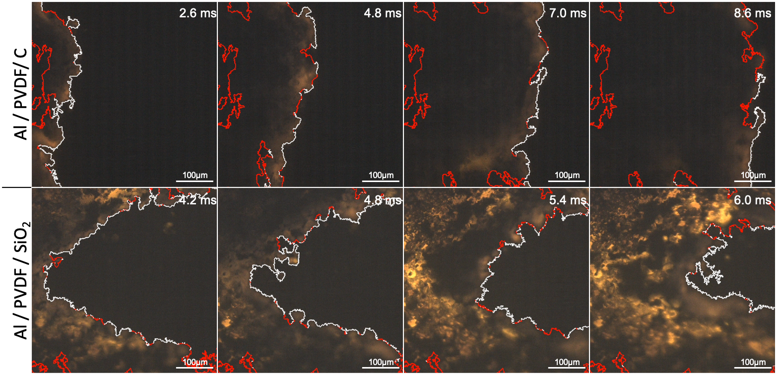 The microscopic images we depicted in our article revealed that there was an intrinsic microstructure to our reacting films which could be readily quantified. At the time of the Nature Communications article being pressed, I had already concluded another study which demonstrated our ability to measure the length of a combusting reaction front and estimate microscopic velocity using software I developed. This article titled “Why does adding a poor thermal conductor increase propagation rate in solid propellants?” can be found in Applied Physics Letters.
