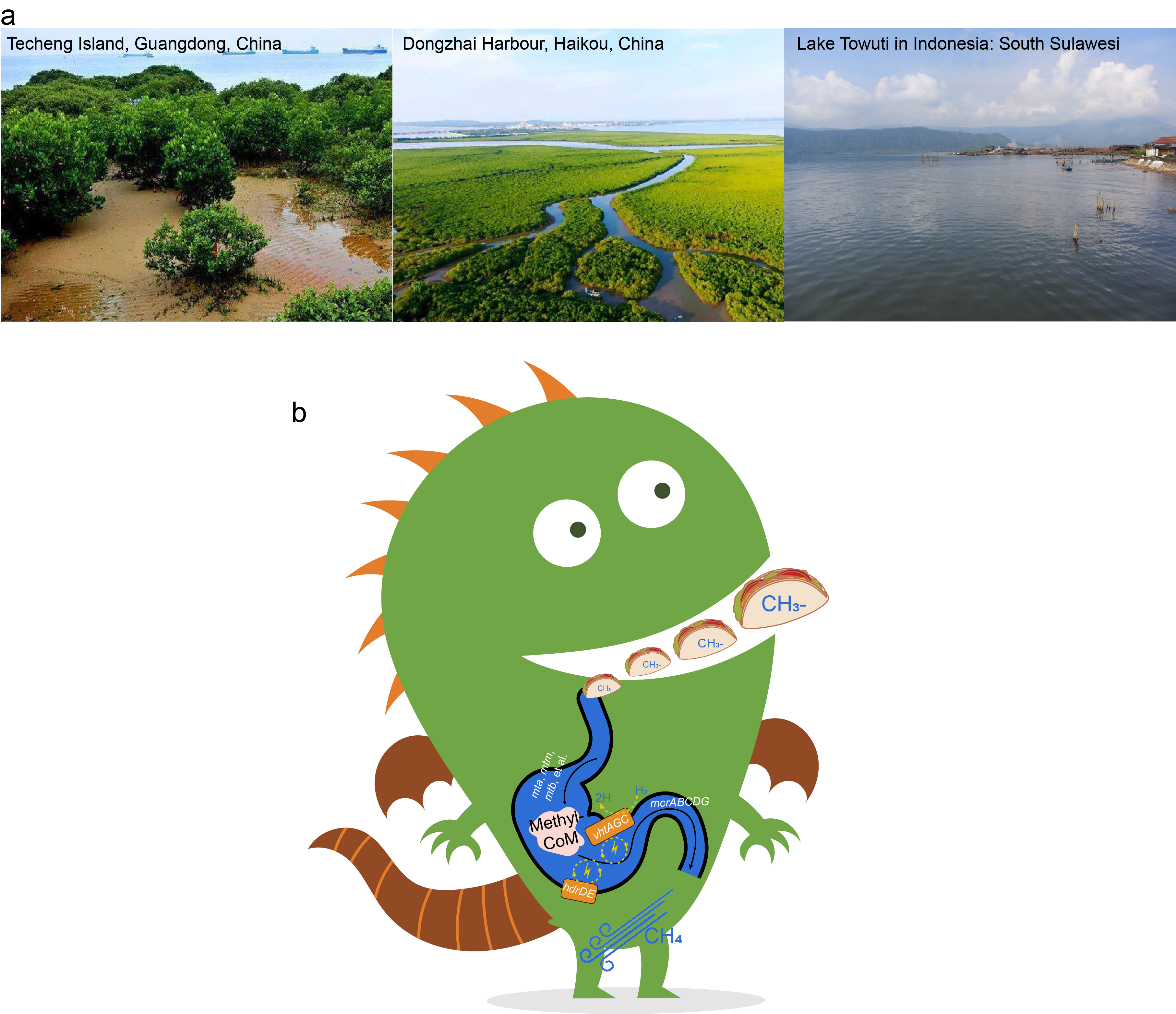 Wetland is an important source and sink of methane. Methane produced by methanogenic archaea has a great influence on Earth’s climate. Methanogenic archaea can be divided into two subgroups based on whether they use b-type cytochromes to conserve energy. Methanogens with b-type cytochromes have a wider range of substrates and higher growth yields than those without b-type cytochromes [1,2]. Here, we report seven metagenome-assembled genomes harboring methyl-coenzyme M reductase genes recovered from in mangrove nature reserves of Techeng Island and Dongzhai Harbour in China as well as Lake Towuti in Indonesia (Fig. 1a), representing a novel archaeal order, designated the ‘Ca. Methylarchaeales’ (Fig. 1b), of the phylum Thermoproteota.