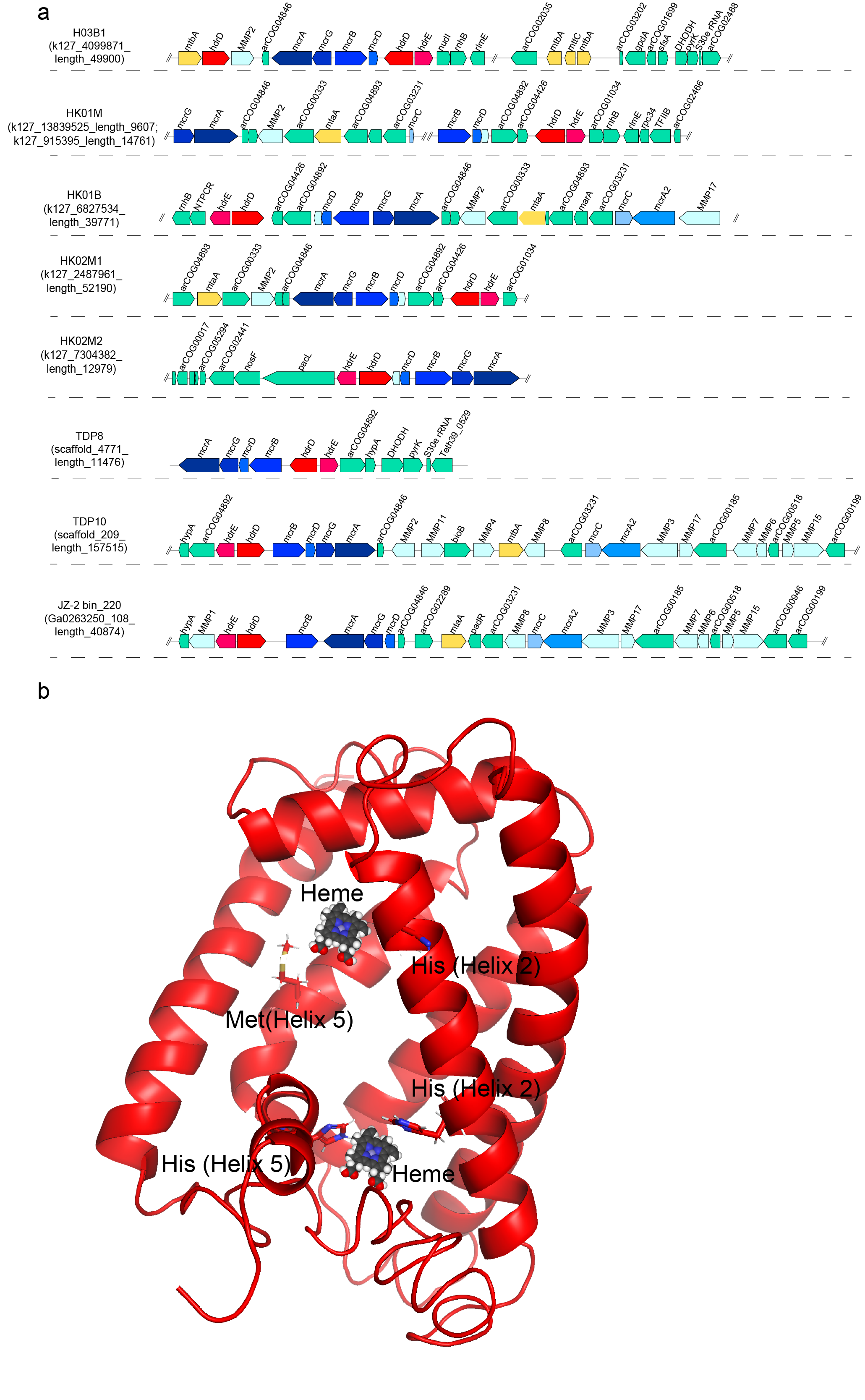 Fig. 2. Gene composition of contigs/scaffolds containing the gene cluster of mcrABG and hdrDE (a) and structural model of b-type cytochromes in HdrDE (b) in the ‘Ca. Methylarchaeales’.