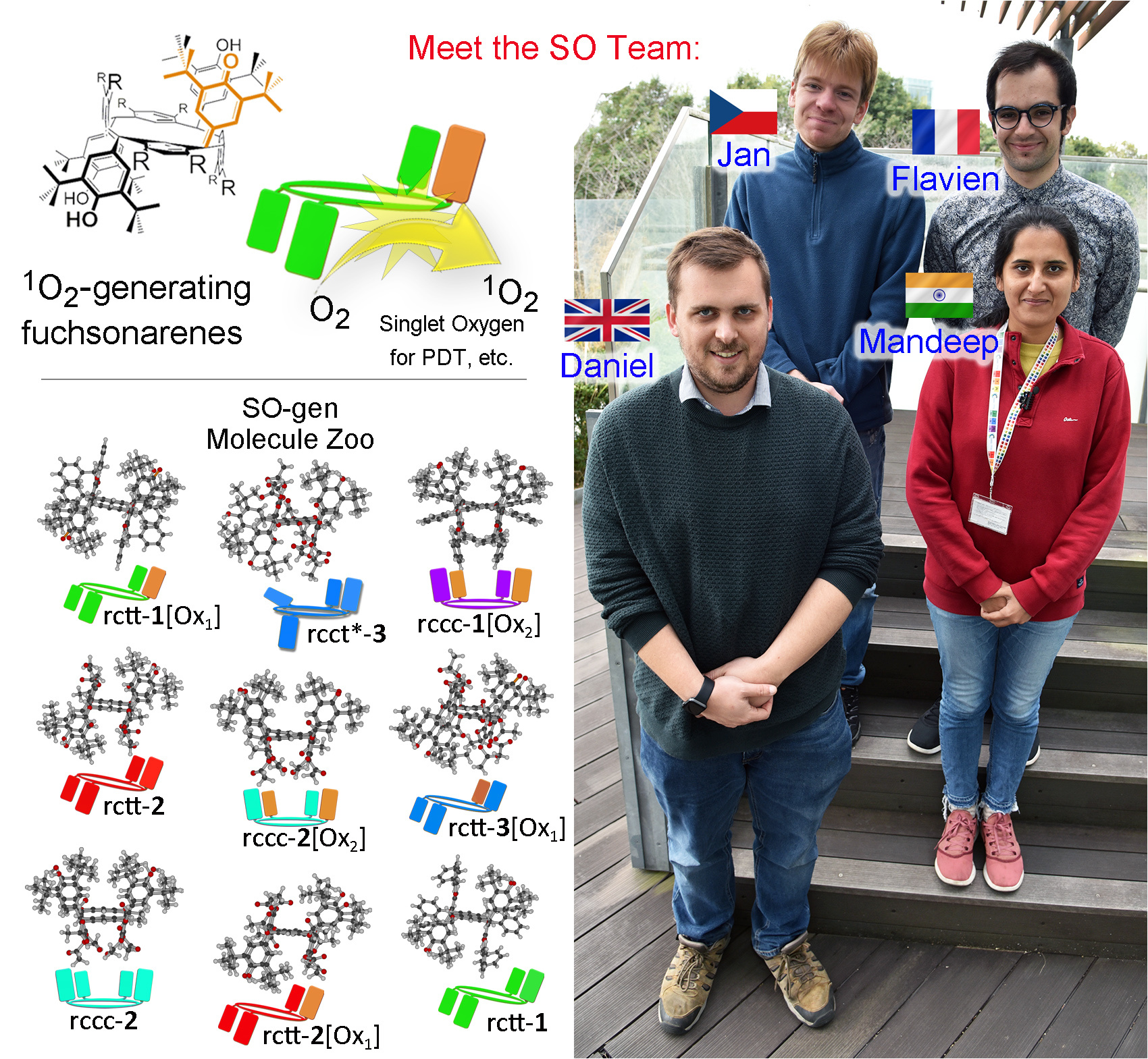 Figure 1. Top left: singlet oxygen generating (SO-gen) fuchsonarenes. Lower left: X-ray crystal structures of a partial Molecule Zoo of the so-far reported compounds. Right: the SO-gen team at NIMS Namiki: anticlockwise from left: Dr. Daniel T. Payne, Dr. Mandeep K. Chahal, Dr. Flavien Sciortino and Dr. Jan Hynek. Daniel, Flavien and Jan came to NIMS through the JSPS Fellowship Scheme, an excellent means to reach Japan as a postdoc. Interested parties contact: Jonathan P. Hill (MANA Project) for further information.