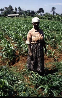 Mrs. Pauline Ruiru, on her farm near Githungiri, central Kenya, standing behind an MSV-infected plant.