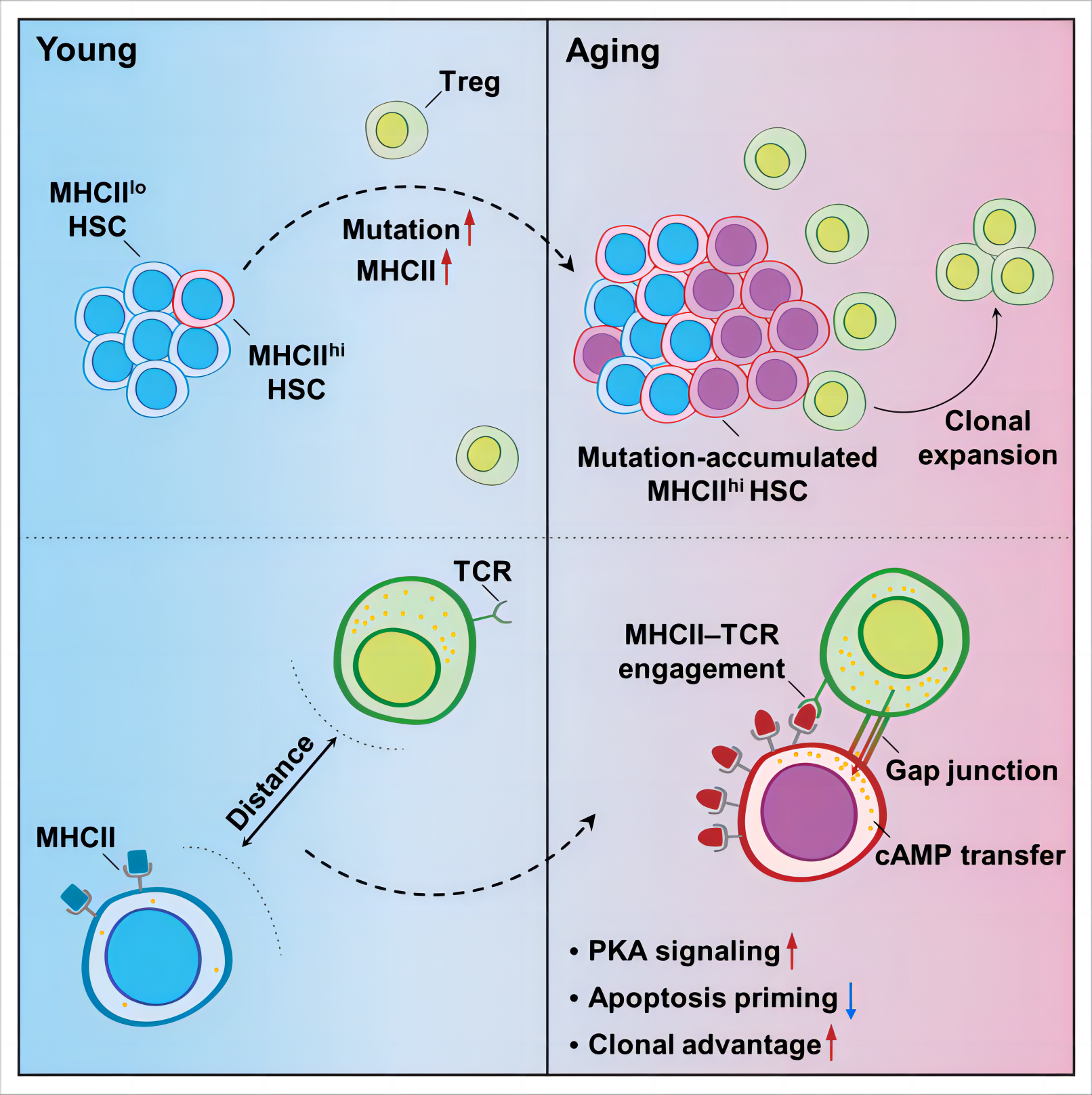 The present study has unveiled an active and self-protective mechanism for aged HSCs to obtain clonal advantage by entrapping local Tregs to construct a pro-survival niche (Figure 1). Therefore, our findings present a promising strategy for preventing HSC aging by intervening aged HSC–Treg interaction.
