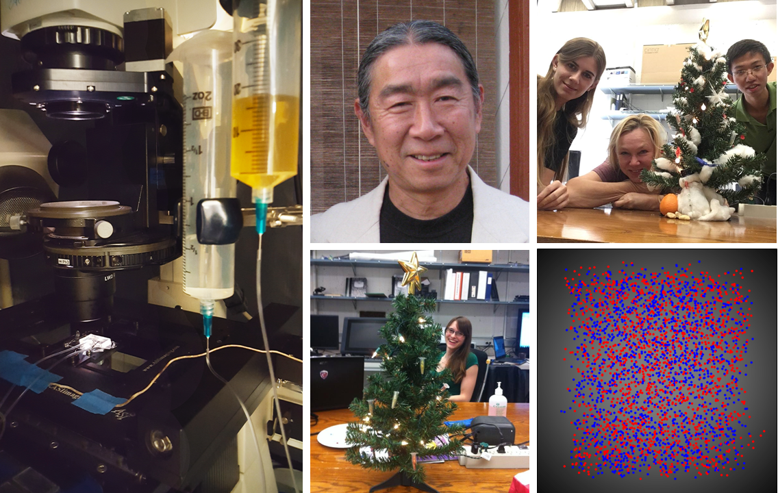 On the left, a microfluidic device set up on the microscope. The team that made this study: Lin Chao, Audrey M. Proenca, Camilla Ulla Rang, Chao Shi, and Christen Buetz. Author contributions: CB brought the Christmas tree; AMP, CUR, CS and CB provided decoration with lab supplies; LC pretended he didn't see it (and turned out equally fond of the tree). We thank C. Aguzzoli for kindly contributing with the snowman. On the bottom right, the messiest plot of this study, showing the absence of spatial bias between new and old daughters within a microfluidic device. It became our lab t-shirt.