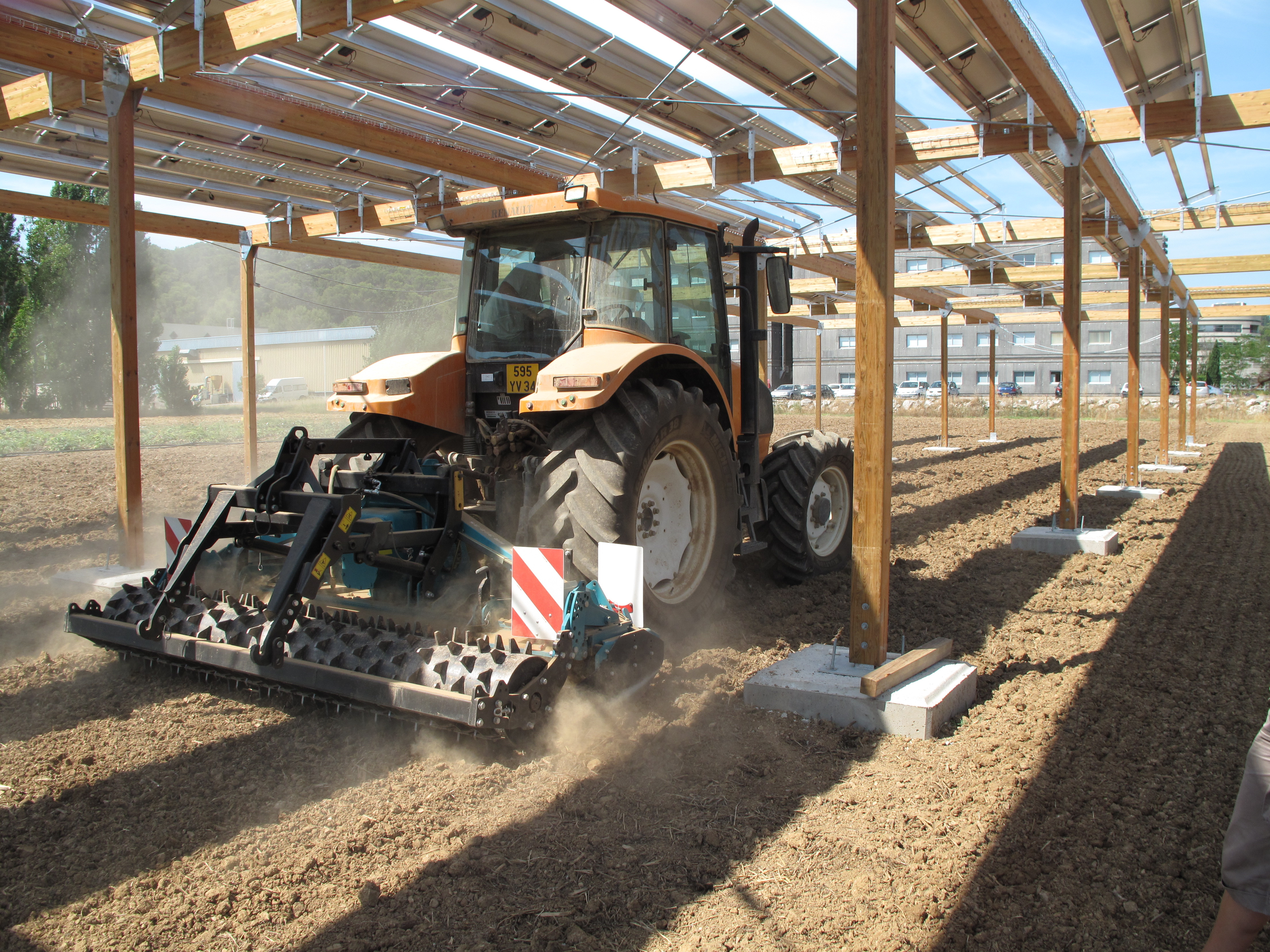 Figure 1 : soil preparation for cereal sowing under the agrivolatic device. France, autumn 2010. Photo: Hélène Marrou.