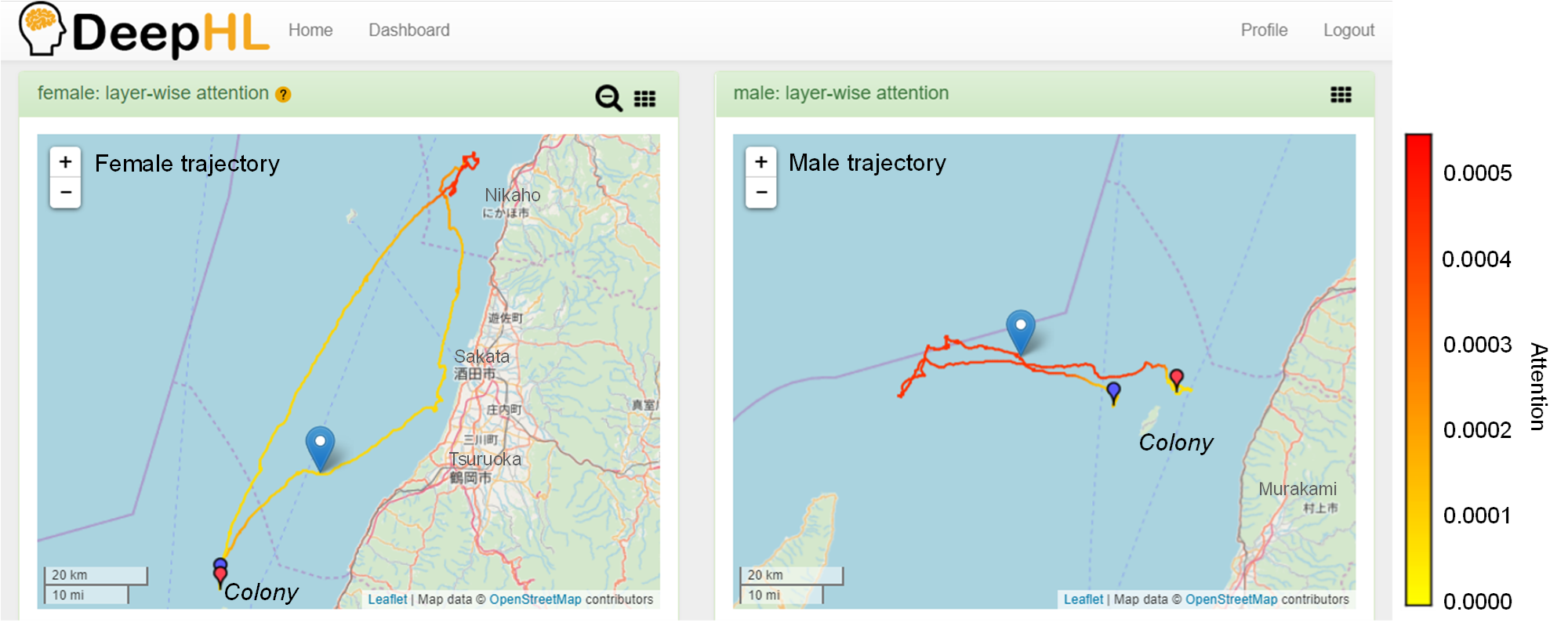 Screenshot of the DeepHL web interface comparing the trajectories of a female (left) and male (right) streaked shearwater. Characteristic segments of the trajectories are highlighted in red. This example indicates that female birds prefer areas close to the coastline.