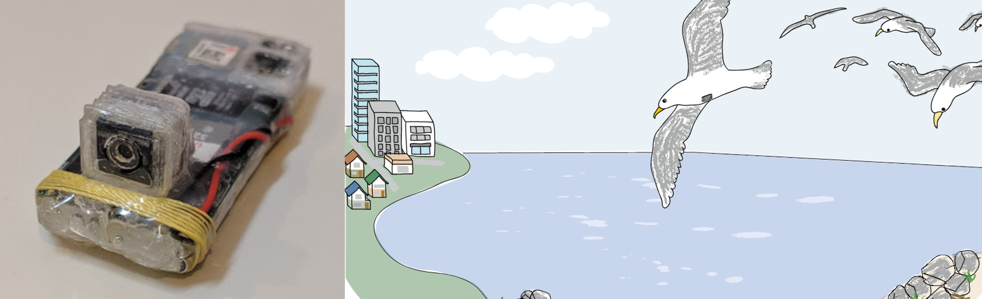 The bio-logger equipped with a camera developed by us (left; latest version) and animal behavior observation with bio-loggers (right)