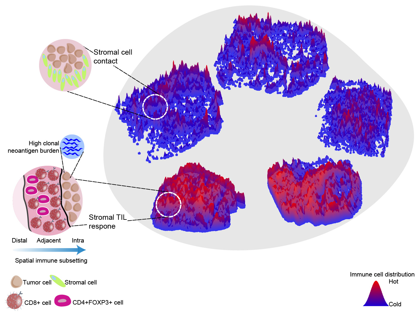 - Compared with immune hot regions, immune cold regions tend to have a more irregular geometric interface between cancer and stromal cells, as measured by fractal dimension.