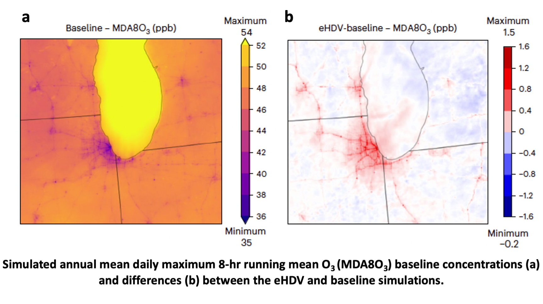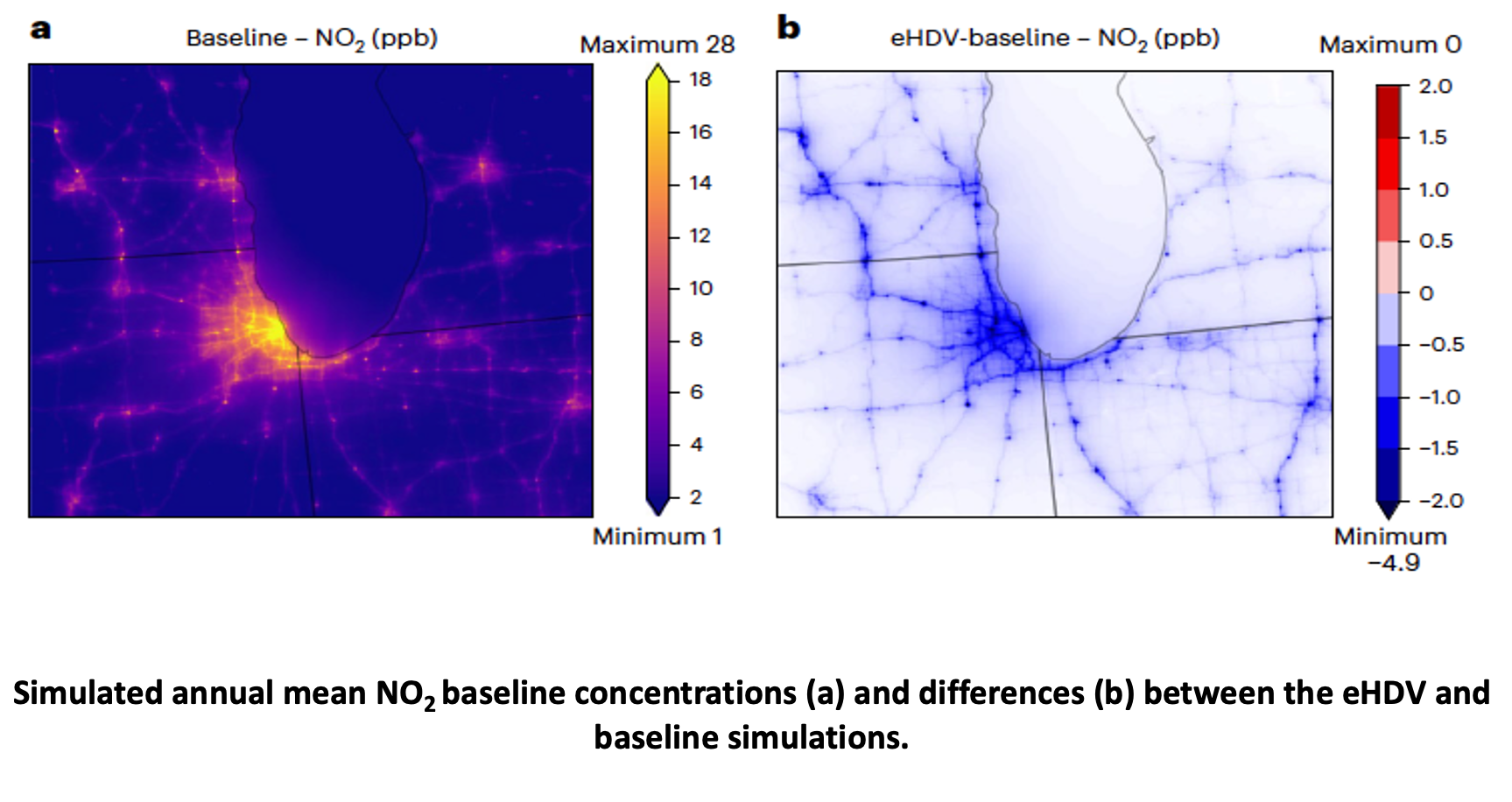 While we estimate large benefits associate with a 30% shift of HDVs to electric, we note some important trade-offs. Firstly, our results show that within urban areas and along highways, shifting to eHDVs can increase ozone concentrations (O3). Ozone is a secondary pollutant which is not directly emitted into the atmosphere but forms through complex atmospheric and chemical interactions of pollutants such as NOx and volatile organic compounds in the presence of sunlight. Within the troposphere, O3 exposure is not beneficial to human health and is linked to various adverse health outcomes such as asthma but can also lead to premature mortality. We estimate that within our study domain, the health impacts associated with increases in O3 concentrations add up to 50 additional premature deaths per year. This suggests the need for holistic incentives targeting co-related pollutants including volatile organic compounds especially for regions with a similar atmospheric composition.