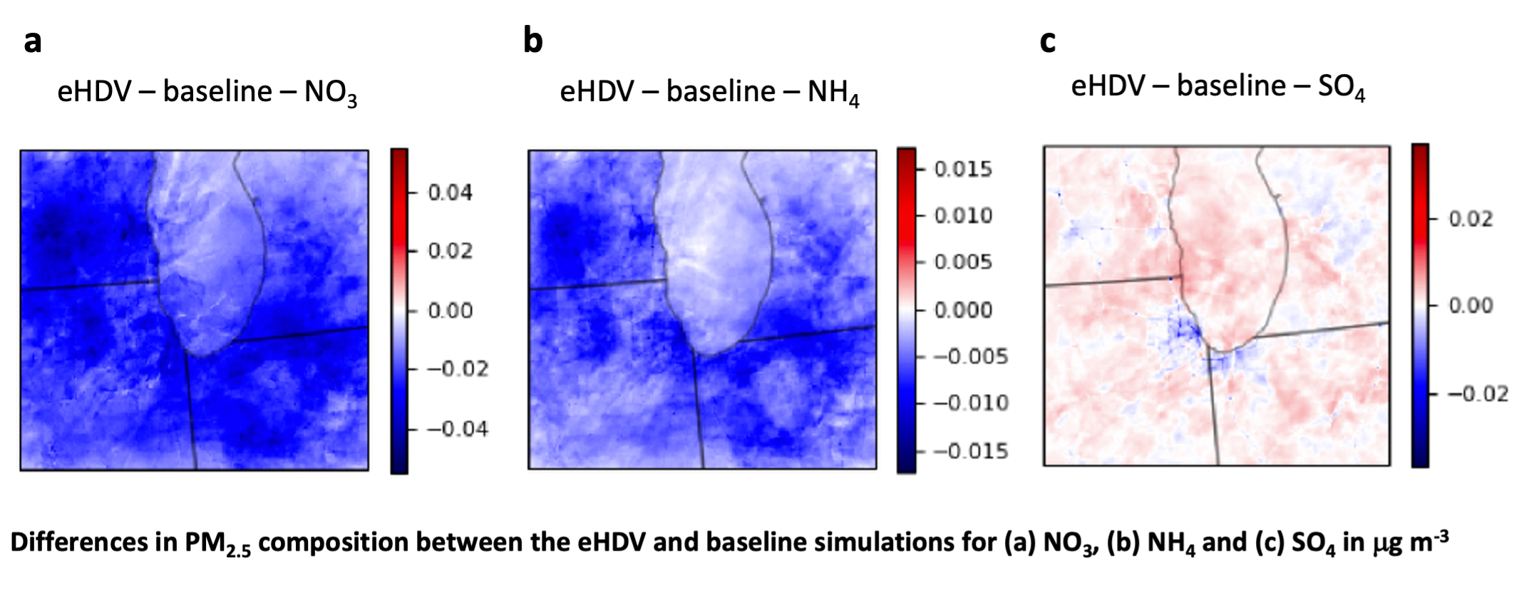 Secondly, despite simulating domain-wide reductions in PM2.5, we note changes in the composition of this pollutant such that the sulfate aerosol (SO4) increases while nitrates (NO3) decrease. This result is linked to increases in sulfur dioxide (SO2) emissions within our domain, a source attributable to coal power plants. Lastly, in this work we only represent the impacts associated with electrification of HDVs however, we note that this transition will not occur in isolation, but rather will occur in conjunction with other vehicle classes (e.g. light-duty vehicles; Visa et al., 2023), alternative fuel technologies (e.g. hydrogen; Jacobson et al., 2005) and changes in other forms of emitting infrastructure (e.g. heating/cooling, cooking stoves; Gould et al., 2023) amongst others.