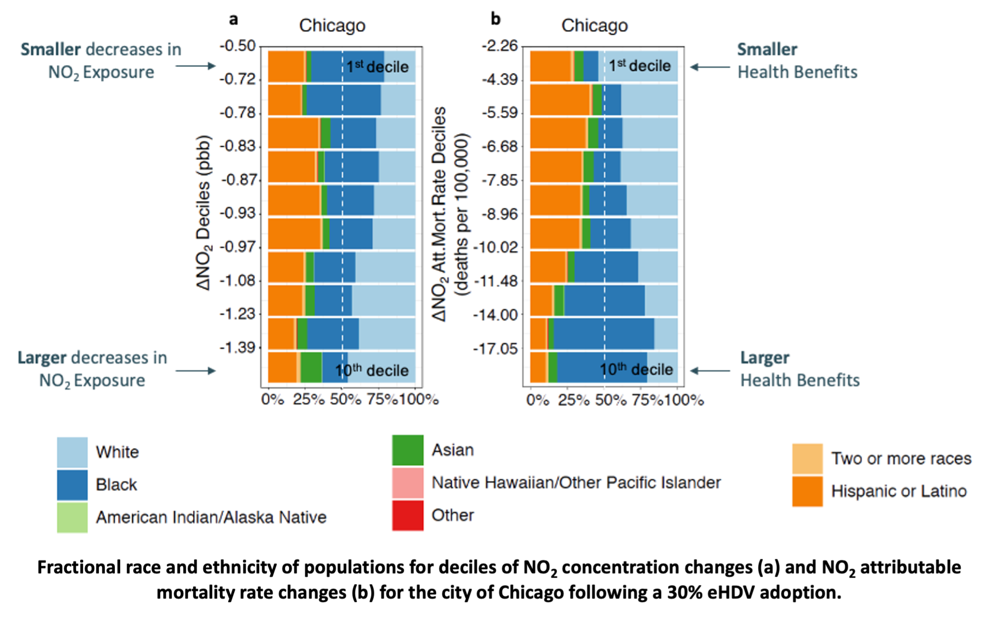 Additional co-benefits of transitioning to eHDVs are the associated air pollution attributable health benefits. We estimate that within our modeling domain, transitioning 30% of HDVs to electric will result in around 590 annual avoided premature deaths. Taking the city of Chicago as an example, we find that, at all levels of NO2 reductions, people of color represent the majority of the racial/ethnic composition (>50%). However, this impact is amplified when looking at health benefits.