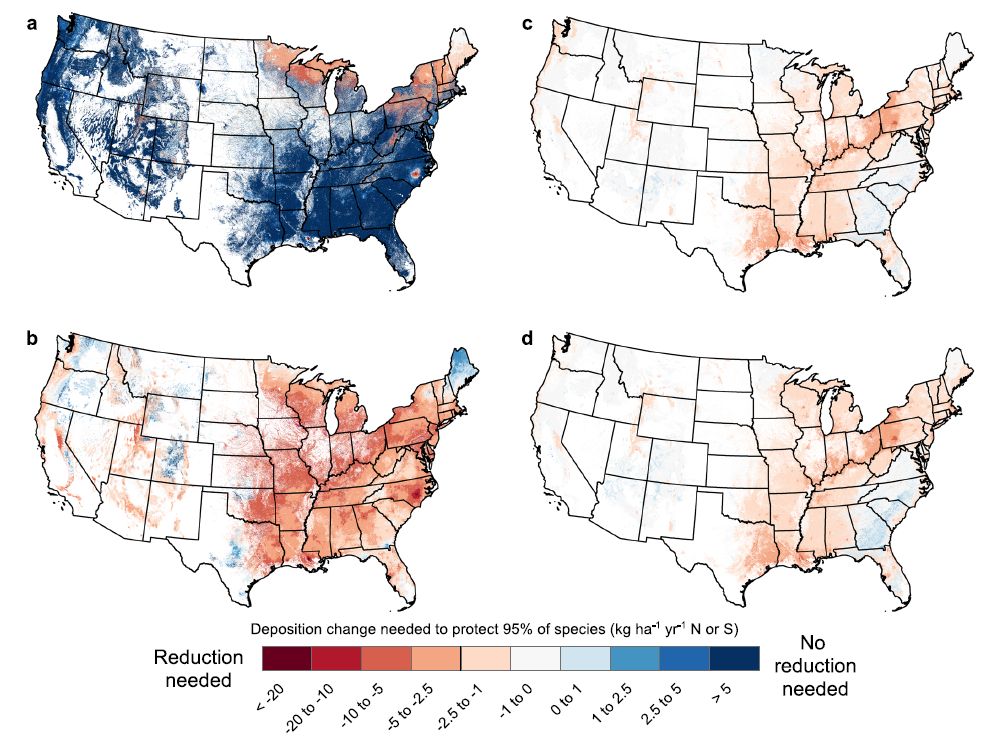 We can look at the effects happening under real-world conditions, but we can also calculate how much air pollution needs to change to prevent adverse effects. Using this approach, we found that over half of the lower forty-eight states need lower nitrogen deposition so sensitive species do not experience harmful mortality rate declines. Roughly half of the contiguous U.S. also needs modest sulfur deposition decreases to protect sensitive species for both health indicators.