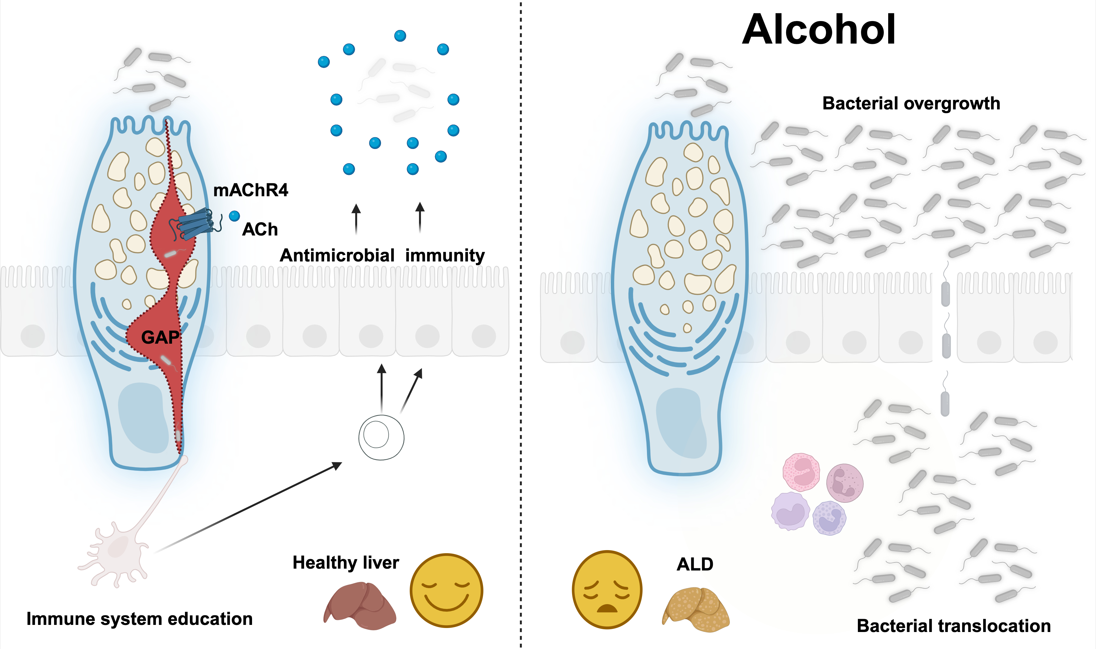 - First Demonstration of the Protective Role of GAPs in ALD. Our goblet cell-specific manipulation of mAChR4 is the first to establish a direct immunoprotective role for GAPs in intestinal homeostasis and liver disease. These findings redefine goblet cells as key immune sentinels in the gut-liver axis and position GAP formation as a therapeutic checkpoint for ALD.