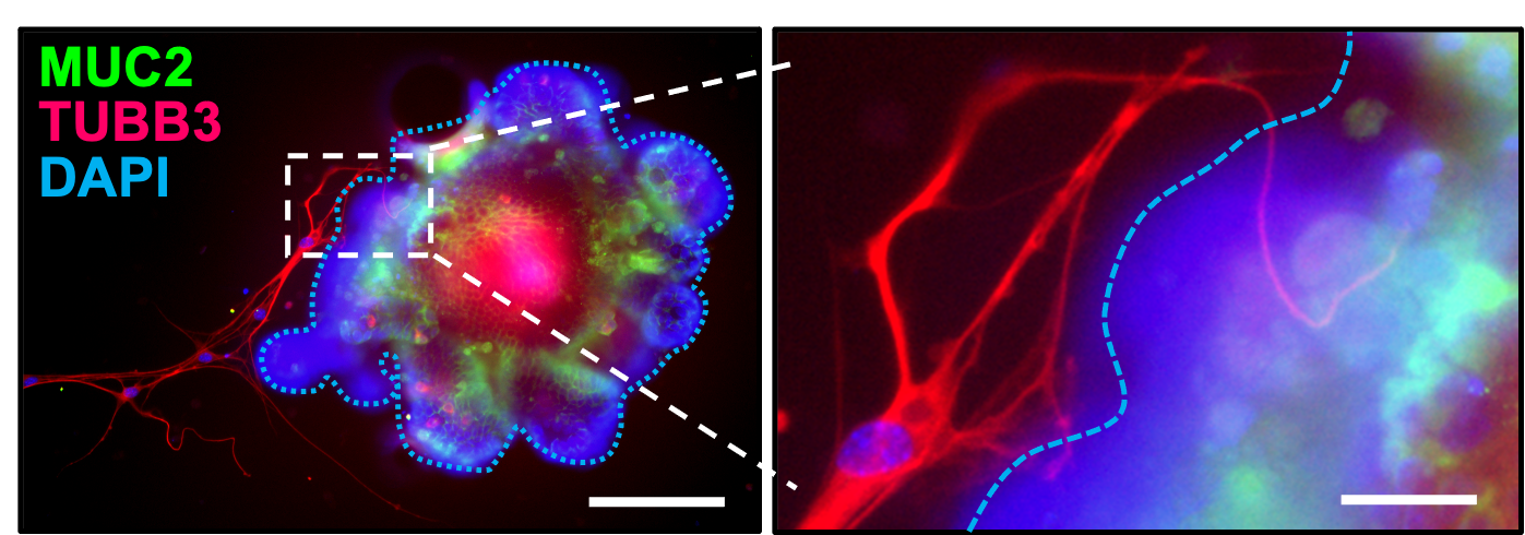Co-cultured mouse SI organoids with enteric neurons. Figure from Llorente et al., Nature, 2025 - mAChR4 Pathway Induction Prevents ALD. Activating mAChR4, chemogenetically, or via IL6ST signaling, restores this immune cascade circuit, reduces bacterial translocation, and prevents ethanol-induced steatohepatitis.