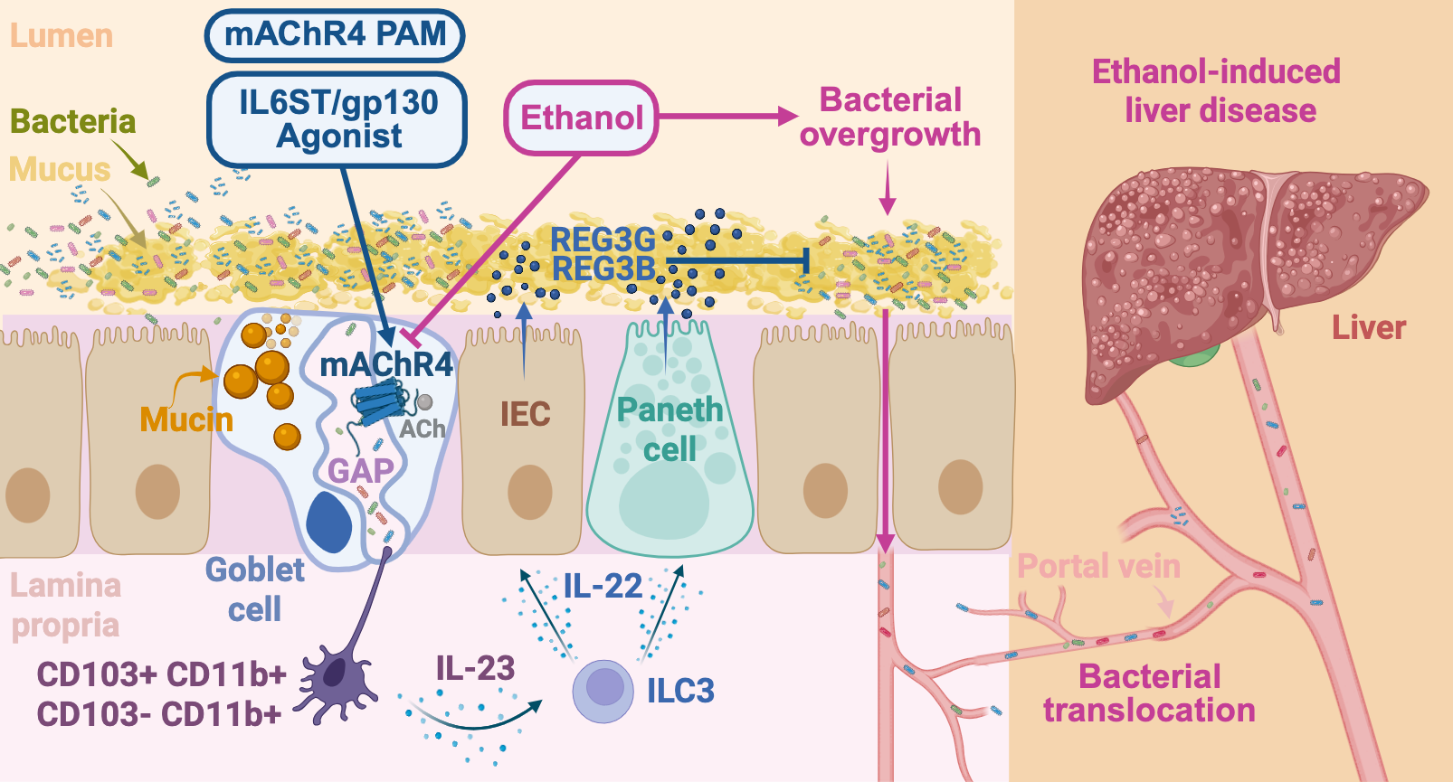 Enhancement of GAP formation through IL6ST/gp130 activation, mAChR4 positive allosteric modulation (PAM), or chemogenetic GC-specific mAChR4 activation promotes expansion and function of antigen-presenting cells (APCs), strengthens gut barrier function, and prevents ethanol-increased mucosal bacteria and translocation through the GAP-APCs-ILC3-IL-22-REG3B/G axis, and Treg-mediated responses. Figure created with a license from BioRender. Figure from Llorente et al., Nature, 2025 -
