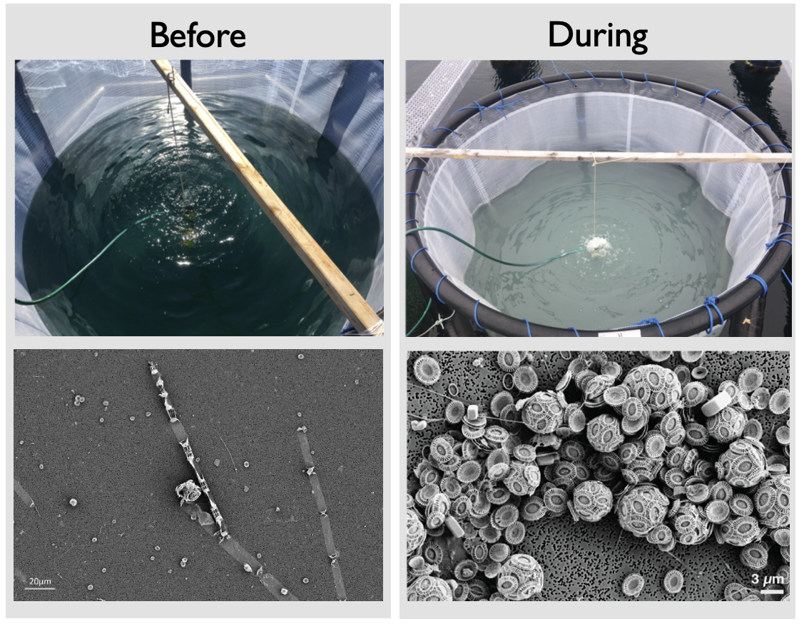 Algal blooms are hotspots of marine primary production and play central roles in microbial ecology and global nutrient cycling, but it is typically hard to predict exactly when and where a bloom will occur, and therefore, time-resolved studies of blooms are difficult to accomplish. In particular, the causes of bloom termination and their consequences on the marine ecosystem remain unresolved. This is where so-called mesocosm experiments are extremely powerful: by isolating a natural inoculum in impermeable bags (Figure 1), they enable repeated sampling of a complex community in a controlled manner. Here, our goal was to observe an algal bloom from the microscopic (cell counts, microbial community composition, etc.) to the macroscopic (ecosystem-level changes, biogeochemistry) scale to understand what happens when coccolithophore blooms get infected by viruses: how does viral infection alter the dynamics of the blooming algae1, the chemical environment in this transient miniature ecosystem2,3, and the surrounding microorganisms that depend on it, ultimately affecting the fate of carbon in the ocean?
