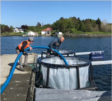 Figure 1: Assaf Vardi and Guy Schleyer filling a mesocosm bag with 11,000L of natural Fjord water that will become our “natural inoculum”