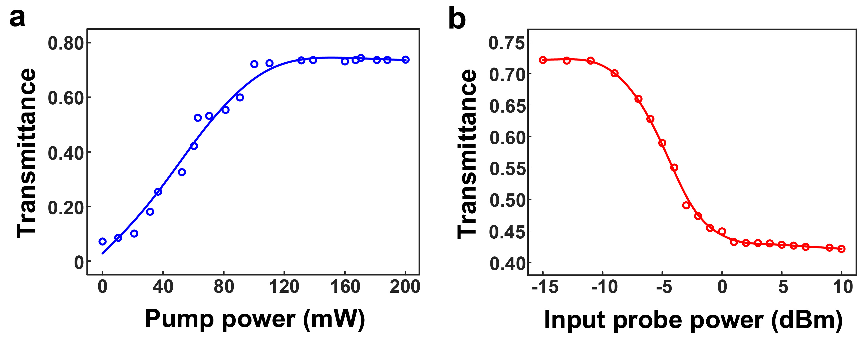 Before verifying nonreciprocity transmission of the device, we need to characterize the gain and nonlinearity of a single FP resonator. This FP resonator is fabricated with same geometrical parameters as the two FP resonators shown in Fig. 1. We first measure the output power when the input probe power is fixed at -15 dBm while increasing the 980-nm pumping power from 0 to 200 mW. A maximum gain is achieved when the pumping power is 100 mW, and further increase of the pumping power will not lead to increasing gain (Fig. 2a). Then, we fix the pumping power at 100 mW while increasing the probe power from -15 to 10 dBm. When the probe power is less than -10 dBm, the highest gain can be achieved, and further increase of the probe power will lead to gain saturation (Fig. 2b). The results indicate that the gain saturation can be achieved by choosing a proper pumping power and a proper probe power. For a single FP resonator, optical nonreciprocity is not possible, since an optical signal injected into the cavity from either direction will be trapped in the cavity and will experience the same gain.