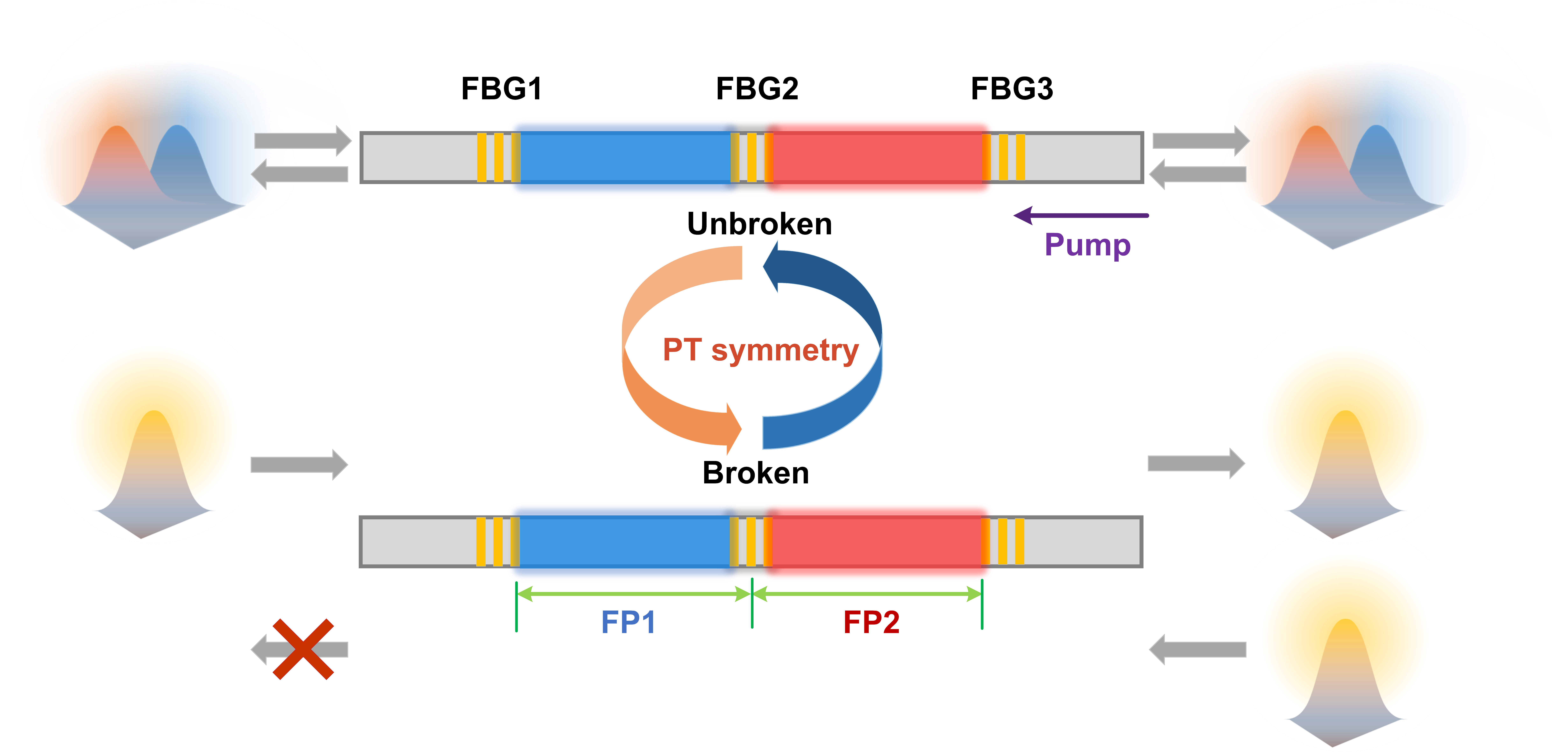 Fig. 1. The device is reciprocal in the parity-time symmetrical regime (top), but nonreciprocal in the parity-time breaking regime (bottom). The gain and loss FP resonators are in red and blue colors respectively.
