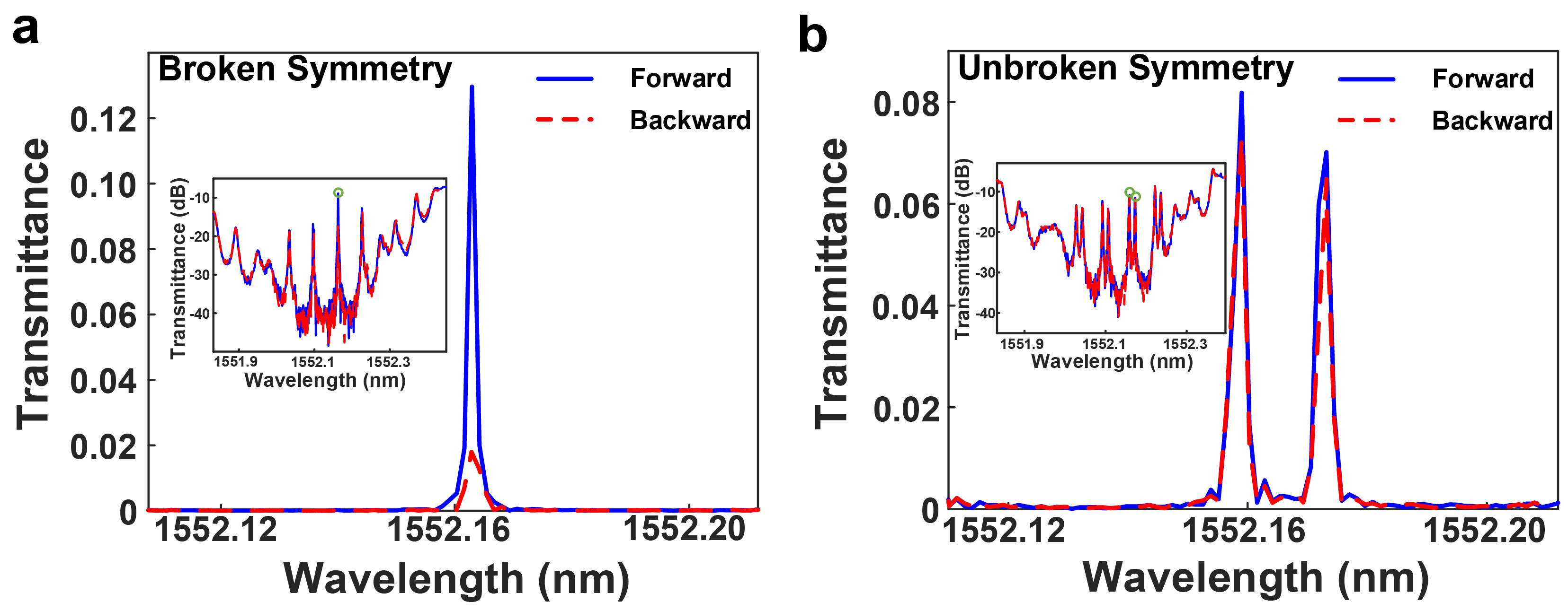Fig. 3. Experimental results of nonreciprocal light transmission of the device in (a) the broken PT-symmetric regime, and (b) in the unbroken PT-symmetric regime. Insets: the total transmission spectra of the device in a logarithmic scale.