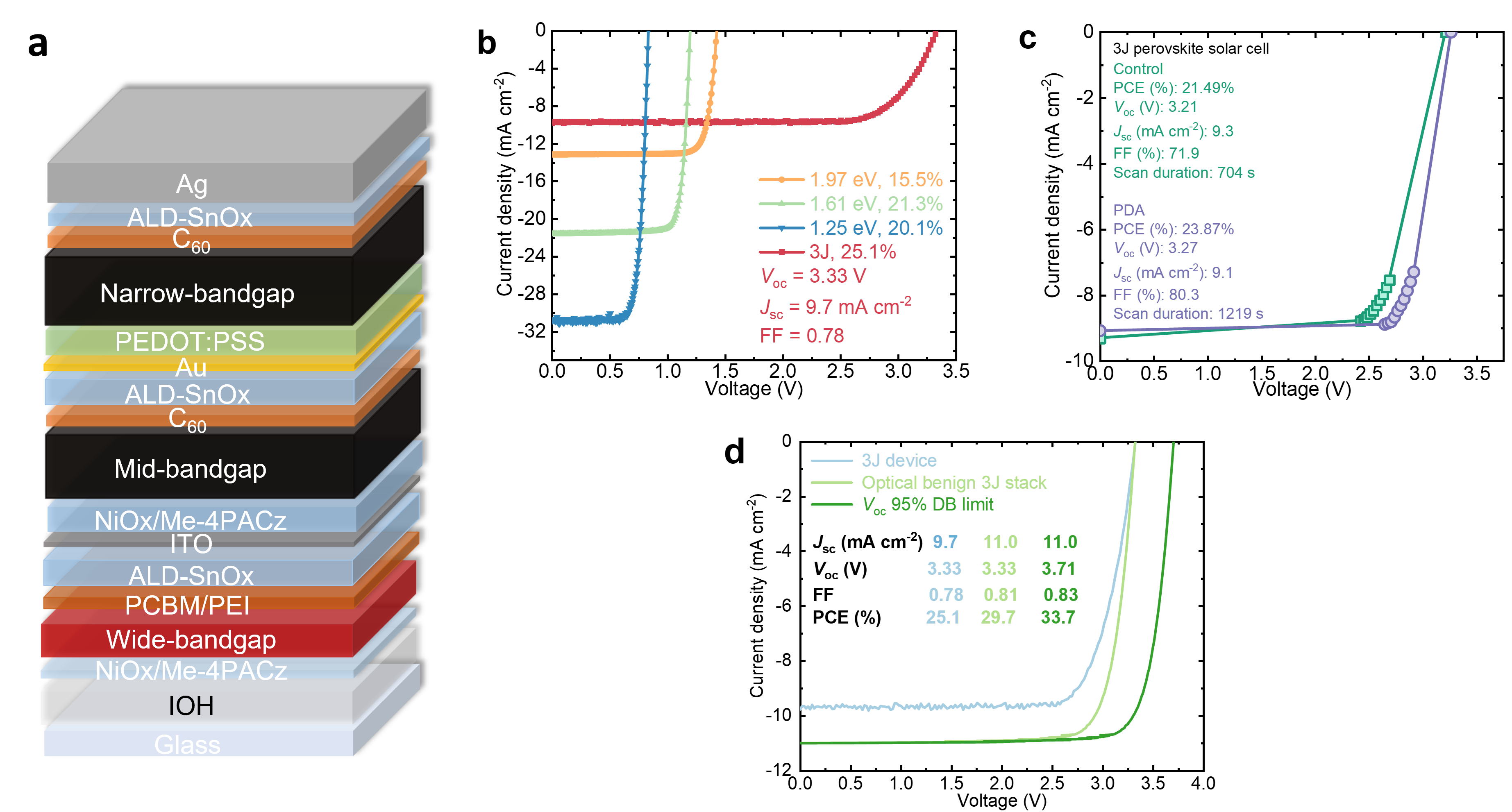 Figure 4. Photovoltaic performance of monolithic all-perovskite triple-junction solar cells. a, Device configuration of optimized 3J cell stack. b, J–V characteristics of the representing 1.97, 1.61 and 1.25 eV and the champion 3J solar cells. c, NREL-certified J–V characteristics of 3J devices using a control (green) and PDA-modified (purple) 1.97 eV sub-cells. d, Experimental and reconstructed J–V characteristics of the 3J device from the simulated EQE at different optical conditions and assuming a Voc of 95% of the detailed-balance limit was achieved in each sub-cell.