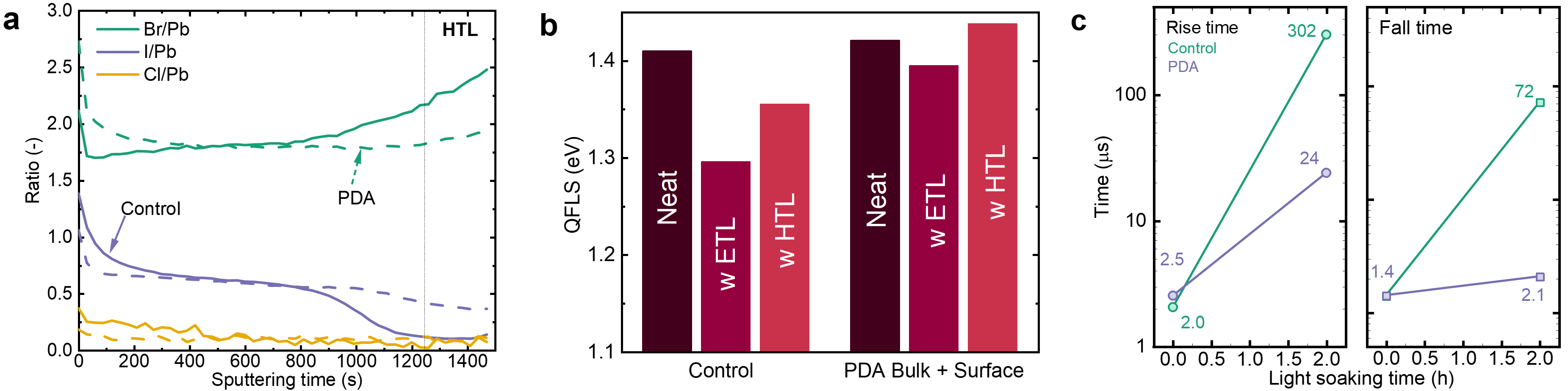 Figure 1. Compositional profiles and the impact on the optoelectronic properties of Br-rich wide-bandgap perovskites. a, The ratio of atomic concentrations between halide (Br, I, and Cl) and Pb atoms obtained from XPS depth profiles for the control (solid lines) and PDA-added (dashed lines) perovskite films. The vertical line is a guide to show the interface with the HTL. b, QFLS of control and PDA-added perovskite films deposited on glass (neat), with an electron-transporting layer on top (w ETL), and on a hole-transporting layer (w HTL). The perovskite samples are further post-treated with a PDA solution on the top surface. c, The rise (left) and fall (right) time (μs) extracted from transient-photocurrent measurements for the control and PDA-modified PSCs.