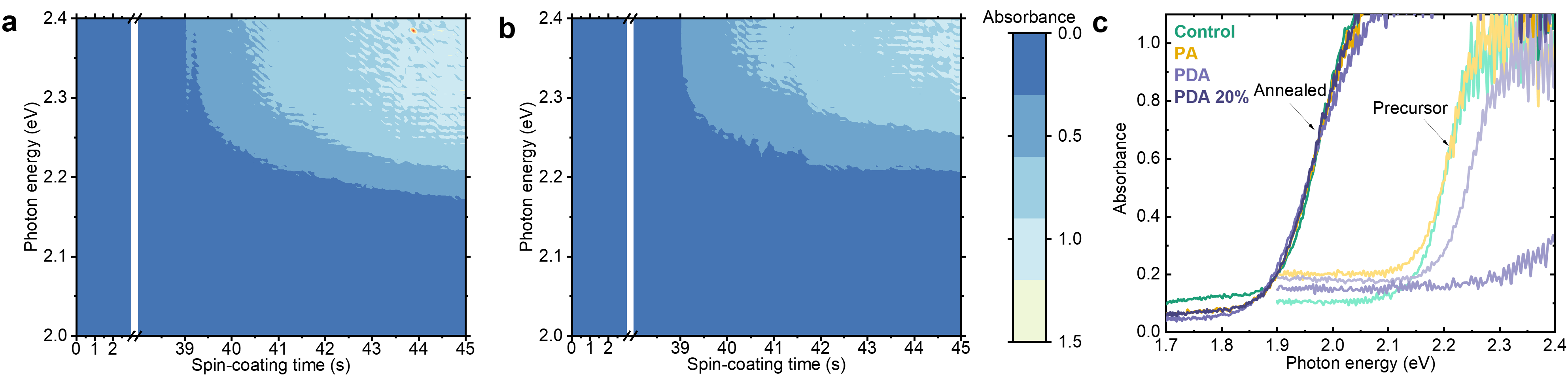 Figure 2. Formation kinetics of Br-rich wide-bandgap perovskite films. Time-resolved absorption intensity maps during spin-coating of a, control, and b, 1 mol% PDA-added perovskite precursor solutions. The antisolvent anisole was dropped onto the spinning substrate at ~39 s. c, The absorption spectra of perovskite precursor films after the spin-coating and after 50 s thermal annealing at 100 °C.