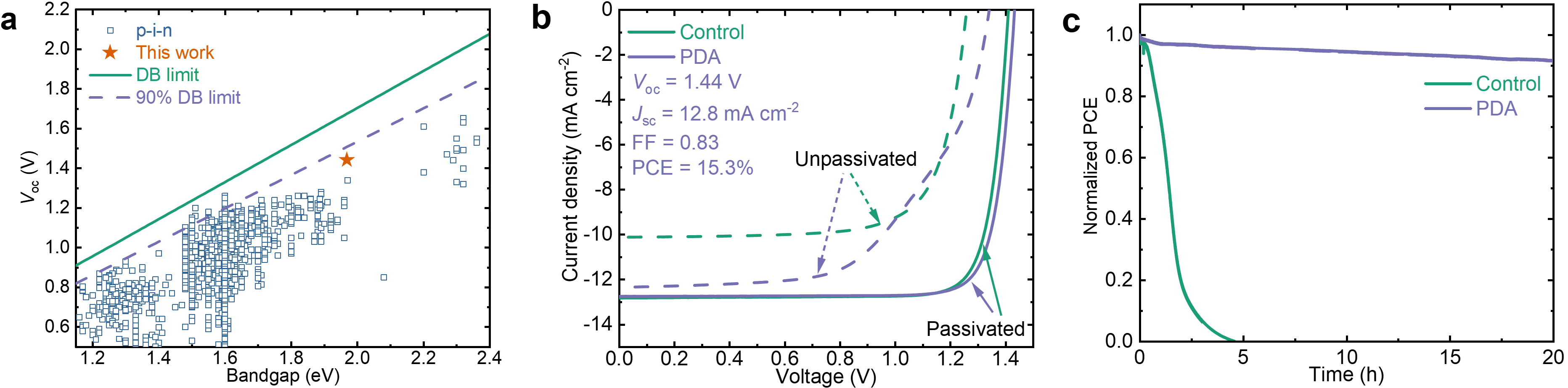 Figure 3. Photovoltaic performance of 1.97 eV wide-bandgap PSCs. a, Bandgap-dependent Voc for p-i-n single-junction PSCs with a PCE above 5%. The cell data was acquired from an open-access perovskite database. b, J–V characteristics (reverse scans) of single-junction 1.97 eV PSCs without (control, green) and with 1 mol% PDA addition (purple) in the perovskite bulk. c, Stabilized MPP tracking of encapsulated control and PDA-modified PSCs in the ambient at room temperature under simulated AM1.5G 1-sun illumination conditions.