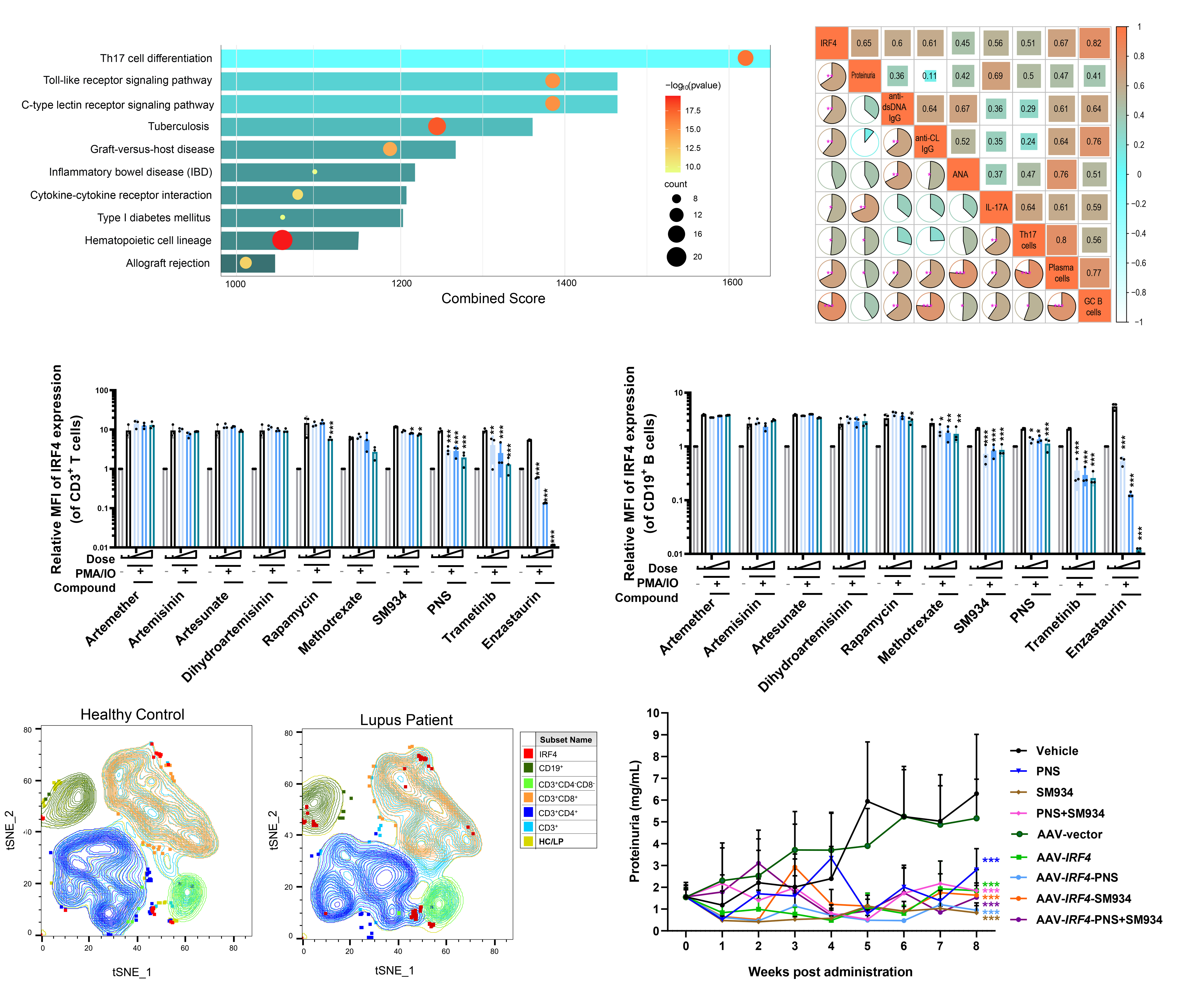 Furthermore, we investigated the potential prognostic and therapeutic relevance of IRF4 in murine models that spontaneously developed syndromes resembling human lupus. The results showed elevated renal IRF4 expression in lupus mice, along with strong correlations with disease progression markers.We also found that inhibiting IRF4 expression in T and B lymphocytes could effectively ameliorate renal dysfunction and autoantibody overproduction in SLE, leading to a promising strategy for SLE treatment by restricting pathogenic T and B cells responses.